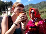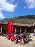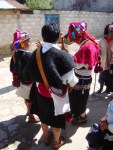 En arrivant à Tenejapa, on s’attendait à voir une manifestation spectaculaire, des défilés costumés hauts en couleur, de la musique qui enflamme les foules… Mais ce petit village situé à 20mn en voiture de San Cristobal de las Casas était bien tranquille en ce milieu de journée. Sur la place du village ecrasée de soleil, les quelques musiciens disséminés, buvant et discutant, indiquaient que la fête était déjà finie et que nous avions loupé notre reportage photo. Sina, déterminée, alla faire le tour des musiciens, leur proposant de jouer un ou deux morceaux afin de les immortaliser en pixels… contre pesos lui fut-il répondu. Finallement elle accepta et $50 firent l’affaire tandis que je me refusais à faire des photos sur commande ! Les musiciens, tout de rouge barriolés et bien bourrés, se levèrent et se rassemblèrent pour interpreter une ou deux chansons, pas plus, puis ils se dispersèrent dans le village…