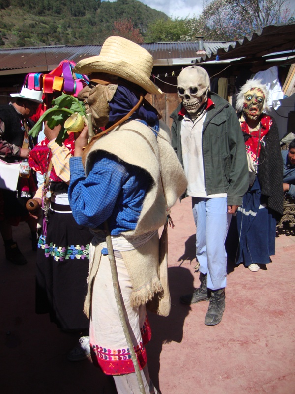 C’est sur le retour que les choses prennent un tout autre aspect, aidé par la dégustation du fameux poch, qui nous aida à rejoindre les habitants dans cet état de locuria et de desmadre qui accompagne cette fête de l’inversion, du retournement des valeurs et des identités. Nous nous sommes approchés puis fondu, à l’invitation d’un groupe de jeunes hommes bien emméchés et bien excités. quelques hommes sont travestis, dont un en vieille femme lubrique. D’autres sont déguisés en personnages ruraux, paillards ou effrayants. Toujours ces masques en plastique hideux made in China et pas de costumes traditionels merveilleusement ouvragés. Non, ce qui compte c’est de favoriser la convivialité avec force weeey. Accompagnés par quelques musiciens aux chapeaux circulaires, garnis de rubans multicolores, typique du Chiapas, les gars dansent et jouent ensemble comme dans une cour de récréation. Ils sont soutenus par les habitants curieux qu’ils croisent, qui s’agrègent et suivent la procession désordonnée jusqu’au prochain arrêt. Car le petit groupe carnavalesque va de maison en maison, où on offre du poch et de la bière. Ils viennent chasser les mauvais esprits avec leurs tronches de train fantôme, s’adonnent avec délice à la satire, principalement sexuelle, mimant des coïts avec la sorcière. En musique, ils boivent, déclament et chantent. Les enfants sont des spectateurs privilégiés et hilares, certains plus âgés peuvent aussi boire du poch s’ils le désirent. Un gamin me demande une cigarette, que je lui refuse et je me fais gronder par un cacique ; je comprends que c’est mal de refuser dans ces circonstances le moindre souhait infantile !