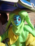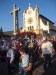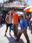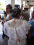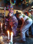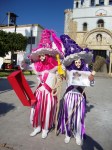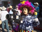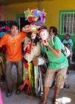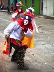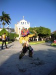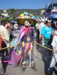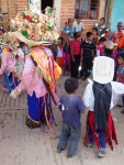 C’est déjà la bonne ambiance dans les rues, beaucoup d’enfants s’amusent et la plupart des adultes sont déjà à la bière, à cette heure matinale. On croise quelques personnages costumés, exclusivement des hommes, ici aussi semble-t-il. Cette fois-ci, nous sommes sûrs de faire une belle récoltes d’images. La foule va s’intensifiant dans la ville, assez grande mais sans grand intérêt architectural, avec des débits de boisson tous les 10m. Assez rapidement on se fait accoster, les deux seuls européens bien repérables ! On se pose un moment dans un bar de rue improvisé, recouvert d’un toit en tôle ondulée, avec une piste de danse sur laquelle des rangées de jeunes, de vieux, de déguisés ou pas, tournent et défilent sur des rythmes de musique traditionnelle et de cumbia. Un gros bonhomme vaguement déguisé en luchador et ses potes nous invitent à boire un verre, espérant qu’on leur payera des tournées, puis il m’offre son masque rose en bois typique du Chiapas, à l’image des conquistadores espagnols, blonds et moustachus.