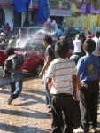 Puis nous changeons de quartier, accompagnés d’un abuelito (grand pére) discret et d’un amoureux éconduit qui brûle les derniers feux de son amour durant le carnaval. Nous croisons pas mal de gens le visage recouvert de masques de Lucha libre (catch mexicain, voir Estupando lucha libre ! ). Tous veulent être photographiés avec Sina, avec force sourires et blagues. Dans le deuxième bar dancing, l’ambiance finit par retomber un peu et nous remontons vers le zócalo ou se déroule une dantesque bataille d’eau, sans avoir été copieusement et recopieusement barbouillés de talc au passage.
