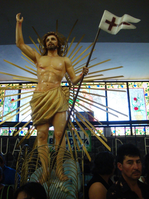 J’ai vu une seule fois au Mexique un Christ en gloire, immense, dans une église moderne et remplie de fidèles de Chignahuapan. C’est un village réputé pour la fabrication de boules de Noël, en sphères soufflées et peintes à la main, où les Mexicains se pressent en prévision des fêtes de fin d’année, afin de faire leurs achats de décoration. Le sapin de Noël est lui aussi un joli symbole, l’arbre aux fruits eternels avec sa promesse de présents matériels comme spirituels, un espoir de récompenses sur terre et dans l’au delà pour conduite vertueuse…