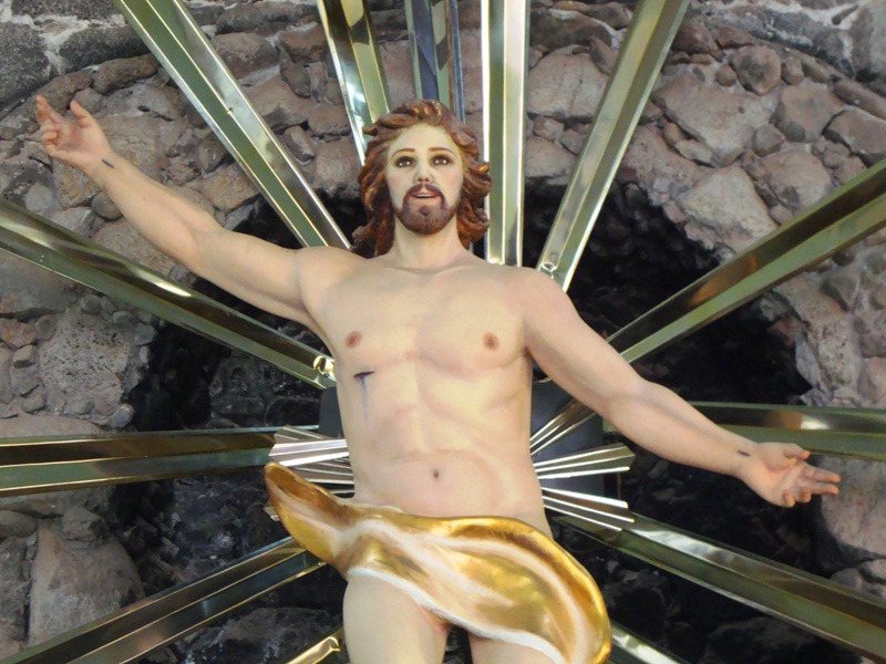 Vivant au Mexique, je n’ai pas pu m’empêcher de faire un parallèle avec les représentations du Christ en souffrance. De nombreuses sculptures polychromes en bois, hyperréalistes et mettant en scène un Jesus à l’épreuve, aux chairs meurtries, écorché, ensanglanté, allant jusqu’à l’incrustation de réels morceaux d’os et de dents, sont offertes à la dévotion des fidèles dans les églises et cathédrales baroques de ce pays, de tradition espagnole très catholique. Des Christs efflanqués, saignant, suant, ployant sous le poids de la croix et rampant, décharnés, cadavériques, allongés et blêmes, les belles églises mexicaines en sont remplies, dans un concours morbide des plus impressionant ! Ils sont souvent présentés dans des cages de verre ouvragées, accompagnés d’ex votos et d’offrandes, de fleurs artificielles… Un summum du kitsch ! Comme ce n’est pas trop de mon goût, j’avais hésité à les présenter ici, seulement tenté par la curiosité et une forme d’exotisme malsain. Replacé dans ce texte, ça me semble plus justifié.