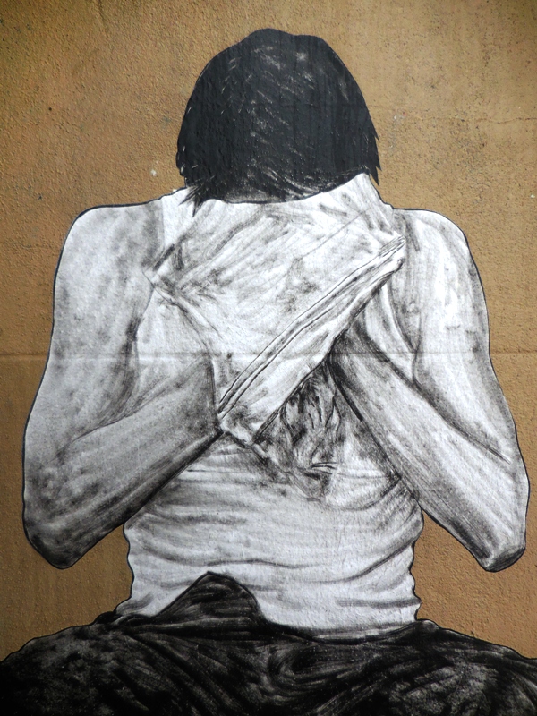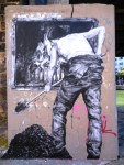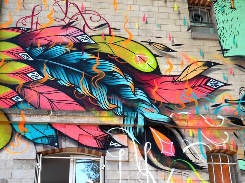 Vagabondant un peu plus loin en direction du parc de la Villette, je tombe sur cette oeuvre de Levalet sous un pont métallique, artiste dont j’ai pu découvrir la participation étonnante dans le cadre de la manifestation In Situ Art Festival, au Fort d’Aubervilliers : une camionnette customisée, des truands de pacotille jouant à la gueguerre des gangs tout autour du véhicule. Avec ses dessins à l’encre de Chine vibrant de matière et se fondant dans la patine rouillée de la carrosserie, cette camionnette d’un autre âge entraînait les visiteurs vers des aventures policières truculentes, dignes des dialogues d’Audiard.