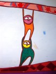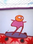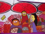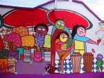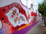 En les sélectionnant, je m’étonne encore de la qualité du travail du Colectivo Tomate. Les enfants du quartier ont participé à la réalisation du long mural, qui se déploie sur tout le mur d’enceinte sud. Le style naïf s’est donc imposé, et les murales représentent une ville idéalisée dans ses activités quotidiennes, avec une touche mystico-catholique.