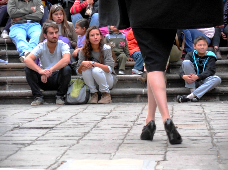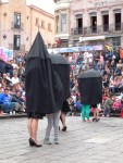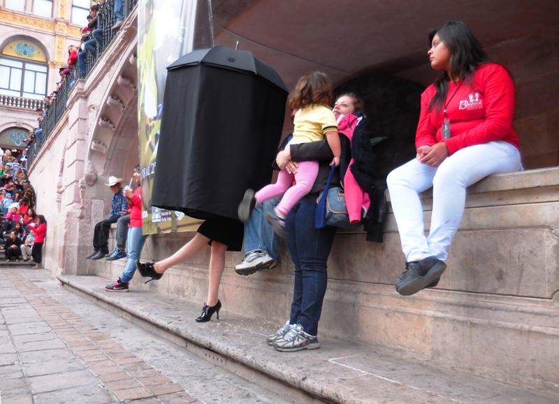 Le public, familial et éclectique, attend, sagement assis, sur les gradins en equerre que forment les escaliers de la Plaza Goïta. Cette plazuela, au centre du centro historíco de Zacatecas, est régulièrement occupée en soirée par les payasos, ces clowns typiquements mexicains. Ou plutôt le Payaso, le même qui enchaîne les rôles et les accoutrements, jour après jour. L’autre soir, il s’était travesti en mariée blonde et invitait les machos à danser avec lui/elle une valse grotesque, déclenchant les rires du public.