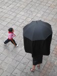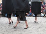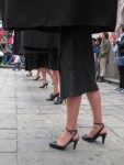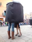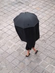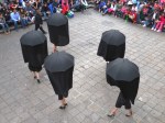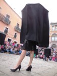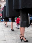 Mais en cet après-midi légèrement voilé mais doux, il y a du remue-ménage au coin de la tienda de confiseries artisanales. Cinq sihouettes, entièrement noires et féminines, surmontées par cinq parapluies noirs, agrémentés d’un tissu noir tombant jusqu’á la taille et occultant leurs visages, font irruption sur la place. Avec contenance, l’étrange procession descend les marches et fend la foule bariolée. Cinq veuves sexy, cinq mystères… Elles ne laissent découvrir que leurs jambes au galbe parfait – ah les jambes des Françaises – qui surmontent de fins escarpins brillants.