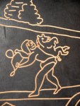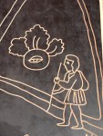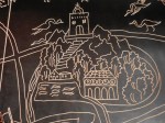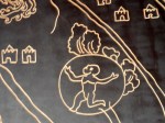 Je me dirige ensuite vers le MUNAL, à deux pas de Bellas Artes. Il n’y a pas particulièrement d’expo, dont les affiches s’allongent en façade qui m’attire, mais je rentre voir ¡Puro mexicano! Tres momentos de creación, une chronologie de l’histoire picturale au Mexique. Une oeuvre contemporaine m’arrête : un dallage de lino gravé, représentant la Ville de México, 30 ans après l’arrivée de Cortés et sa petite armée de conquistadores, qui ont pris puis rasé Tenochtitlan. En si peu de temps, quelques dizaines d’années, les vestiges de la ville impériale disparurent tandis un autre construction urbaine barroque, s’élevait et surtout allait s’étendre à l’horizontale, sur les tracés perpendiculaires de l’ancienne ville, au point d’assécher le lac salé et peu profond sur laquelle l’originale s’était posée.