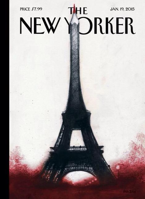 En hommage aux disparus de Charlie-Hebdo, les dessinateurs/caricaturistes et journalistes – Jean Cabut, dit Cabu, Georges Wolinski, Stéphane Charbonnier dit Charb, Philippe Honoré dit Honoré, Bernard Verlhac dit Tignous, et Bernard Maris, économiste et chroniqueur, Mustapha Ourrad, correcteur, Elsa Cayat, psychanalyste et chroniqueuse, – et en écho aux mobilisations du monde entier pour la liberté d’expression, je republie ce très beau dessin d’Ana Juan, « Solidarité » publié dans le numéro de The New Yorker daté du 19 jamvier 2015.