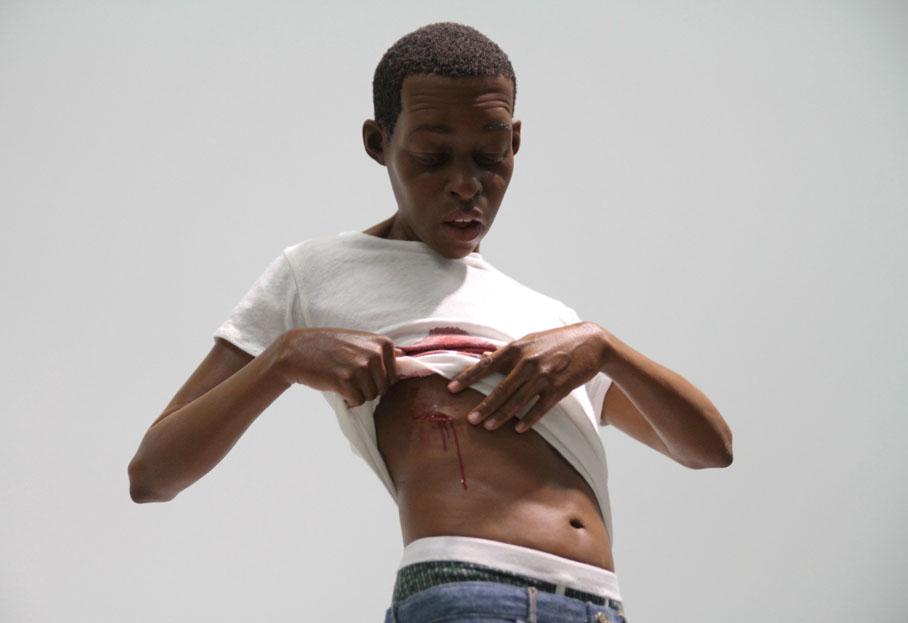 Youth (detail) – Ron Mueck, 2009 – Un jeune homme blessé semble découvrir le sang qui coule de sa plaie, comme saint Thomas découvrait la blessure du Christ dans un tableau du Caravage.