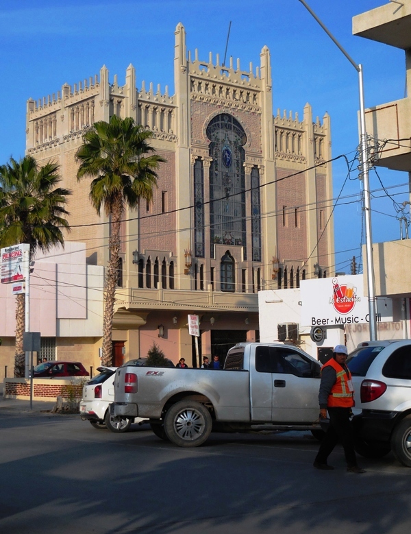 Mais le paysage urbain de Torreón est divers et attachant. Horizontal, fuyant, dégluingué, mais des exemples architecturaux intéressants m’arrêtent : les villas californiennes des années 20-30, des immeubles streamline des années 50, des façades contemporaines post-modernes, en passant par des villas composites, le tout dans un concert de palmiers. Un taxista me racontait que de nombreux Arabes ont contribué à la création de la ville, soit en apportant la culture metissée arabo-andalouse via l’Espagne coloniale, soit en venant commercer directement au Mexique. Le Teatro Martínez est un pur exemple de façade Art Nouveau aux influences mauresques.
