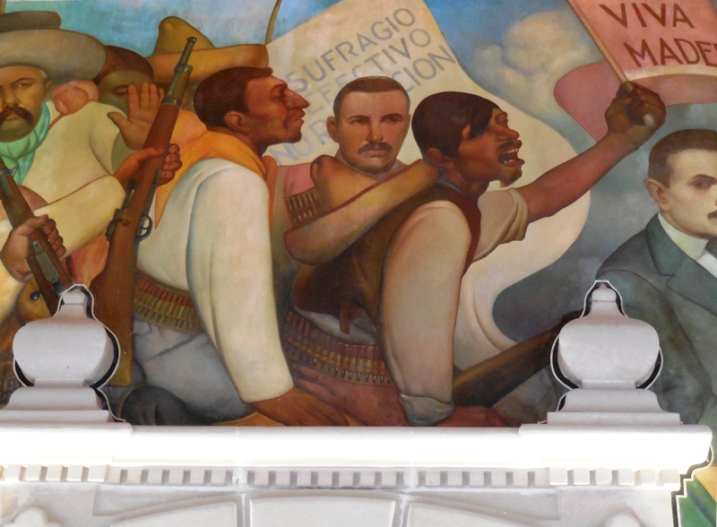 Dans le panneau suivant sont représentés, dans la partie supérieure, Francisco Ignacio Madero et José Marie Pino Suárez, successivement président et vice-président du Mexique de 1911 à leurs assassinats en 1913, à côté de quelques sympathisants populaires qui portent des banderoles avec les légendes de “Sufragio Efectivo no Reelección” (Suffrage Effectif pas de réélection) et “Viva Madero” (Vive Madero). Il s’agit de la mise en scène de l’année 1913, pendant laquelle, après dix jours de combats sanglants le « Chacal » Victoriano Huerta et ses forces rebelles réussirent à exécuter Francisco I. Madero, son frère Guillermo et le vice-président Pino Suárez, usurpant le pouvoir avec l’alliance avec les États-Unis.
