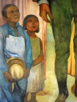 On continue, dans la partie frontale de l’édifice, au fond, avec le panneau la « Lutte des Factions ». La composition s’ouvre sur un groupe de personnages de la région de la Laguna, qui ont appuyé le mouvement armé en 1910. C’est le soulèvement mené par José Agustín Castro, d’Orestes Pereyra, de Gregorio García et Benjamin Argumedo. De leur côté, Calixto Contreras et Severino Ceniceros sont à la tête des habitants révoltés de San Pedro de Ocuila auxquels les terres avaient été confisquées pendant des années, subissant ainsi les abus des grands propriétaires fonciers porfiristas. Cependant que, dans les montagnes de Durango, Domingo Arrieta et ses frères, accompagnés par des mineurs et des paysans remontés contre leurs exploitants, prenaient les armes et se rebellaient (voir photo de couverture plus haut).