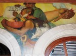 Pour conclure, levant les yeux vers le premier fronton du premier étage au nord, on trouve la culmination de toute la série murale peinte par Guillermo de Lourdes dans le Palais du Gouvernement de Durango. Il s’agit de l’allégorie “La Patria con los brazos abiertos cobijando al pueblo” (La Patrie avec les bras ouverts couvrant le peuple), oeuvre vraiment unique par son échelle, sa composition et son insertion entre les trois arcs centraux.