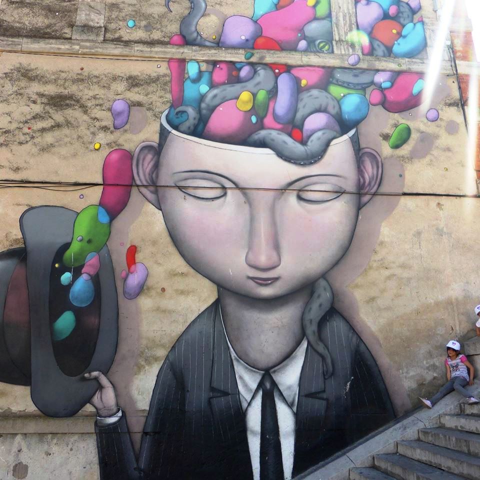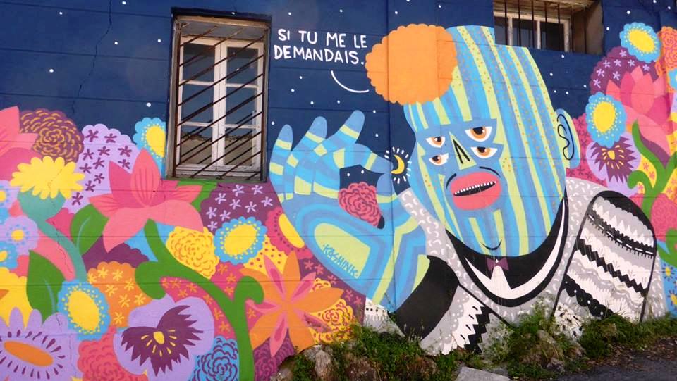 Plus haut, sur la façade aveugle du lycée Paul Valéry, on découvre le monumental Monsieur Tielle, haut de neuf mètres, baptisé d’un nom bien local par Julien Malland, dit Set puis Seth, comme le dieu égyptien, autre référence méditerranéenne. Avec ses couleurs pastels, son univers onirique et enfantin, inspiré par ses nombreux voyages, c’est l’un de mes street-artistes préférés, avec un style largement inspiré de ses nombreux voyages (il se définit lui-même comme « global painter »). Pas étonnant qu’il ait œuvré en Amérique du Sud, et notamment à Valparaiso, autre port mythique !