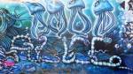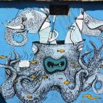 En commençant à s’élever dans les ruelles, on tombe sur la fresque suivante, toujours dans les tons bleus, dissimulée dans la petite rue Doumet, sans doute la plus engagée sous ses airs bon enfant : c’est l’œuvre de Pedro et Kasy K (100 pression), baptisée Exodus, en référence au bateau, qui, en 1947, quitta le port de Sète, avec à son bord des Juifs émigrant clandestinement d’Europe vers la Palestine, alors sous mandat britannique. Le bateau prend ici la forme d’un cétacé, avec à son bord des animaux comme une arche de Noé, mais aussi un pirate et un Georges Brassens fumant la pipe, belle synthèse des différentes faces de Sète (à voir dans le diaporama) !