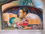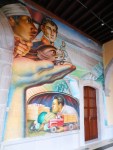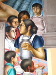 La touche de Montoya, à la manière impressionniste et pointilliste, est toute en fluidités, en courants d’airs frais et subtils. Elle donne un modelé singulier et un saisissant volume aux figures et allégories de ses audacieuses compositions. Toutes les fresques présentées ici se trouvent le long de la galerie du patio au premier étage. On en voit l’échelle grâce à la photo un peu floue ci-contre de cette mère de famille, une paysanne pareille à une Vierge soviétique sur l’uniforme duquel resplendit le bleu de la toile d’un pantalon, flottant au dessus du sol avec ses enfants, et d’une passante plus bas.