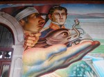 Les fresques de Montoya sont un hommage, une campagne nationale picturale et enthousiaste du productivisme et de la planification économique socialiste. Dans un premier temps ces fresques n’ont pas arrêté mon regard malgré leur présence et leurs dimensions. Mais en m’intéressant aux personnages surprenants, tous semblant figés dans une scène qui les immortalisera – les rendant semblables aux anciens dieux aztèques, nouveaux dieux de la prospérité, de la technique et de la guerre – il m’est apparu plus facile d’entrer dans l’oeuvre : enfants hypnotisés à l’école, étudiants à l’air revêche sortant de cours, le petit peuple, paysans, mineurs, ouvriers en représentation dans leurs environnements propres, encadrés par des hommes de science, des ingénieurs, des hommes qui savent et bravent l’horizon d’un air serein.