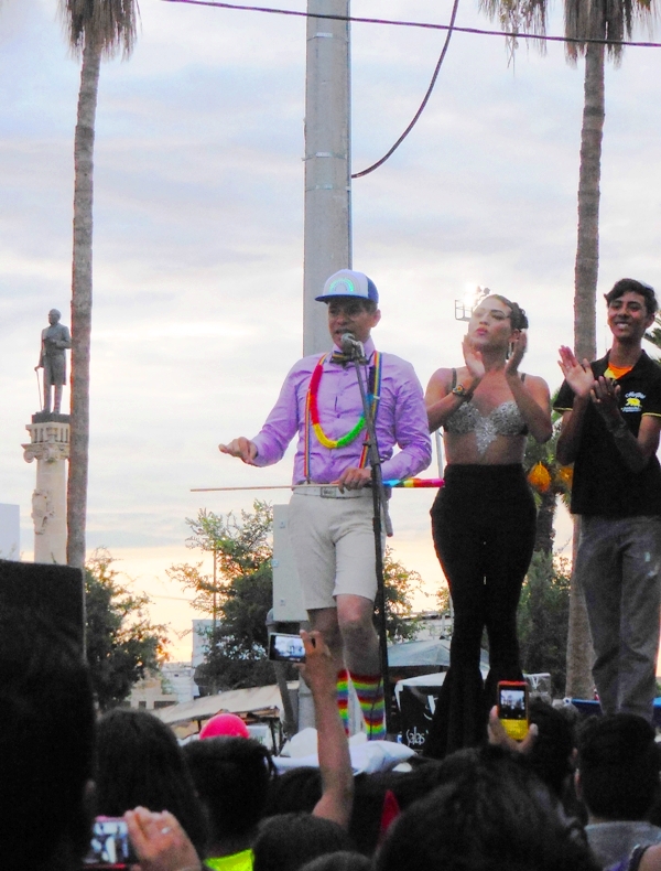Discours de clôture de la « Marcha del orgullo gay » : en arrière-plan, la statue de Benito Juarez, bienveillant, et sur l’estrade, Monsieur Loyal Gay de Torreón.