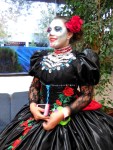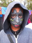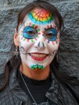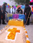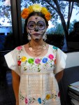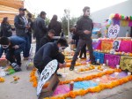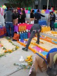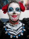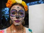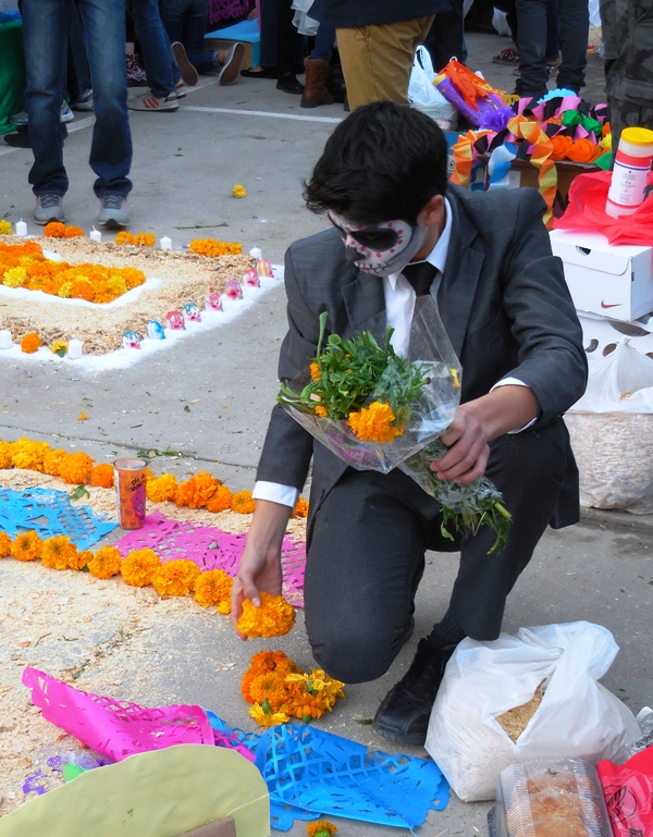 Voici les plus beaux costumes de cette fête des morts mexicaine privée, ceux que l’oeil du photographe a pu repérer dans cette foule bigarée, remuante et en pleine activité : certains mettaient la dernière pierre, dernière fleur de cempasúchil aux autels, en hommage à des personnalités mexicaines du monde de la science et de l’éducation, telle cette physicienne XXX ; d’autres, la touche finale à leur costume sophistiqué, leur masque de Catrina pour les filles, ou de Catrín pour les garçons, se maquillant mutuellement dans une joyeuse excitation et un soin appliqué.