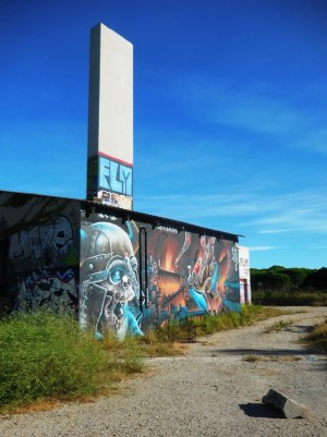 Situé en bord de mer, ce spot bien connu des street-artistes des environs ou de passage, vibrait ce jour-là de toutes les couleurs de ses graffitis. Cet ensemble architectural des années 50, constitué de différents corps disposés entre la plage et la route, est aéré, horizontal et de type fonctionnel. Il peut aussi faire penser à un hôpital désaffecté et faire verser dans le pathos, un espace ouvert aujourd’hui à tous les vents mais abritant encore quelques fantômes. Combien d’existences se seront croisées dans ce bel environnement hygiéniste avec l’horizon azur comme ligne de mire, impression accentuée par l’état d’abandon, les vandalisation et autres destructions du temps. Mais surtout par ces oeuvres criant la vie comme un manifeste, au milieu d’imaginaires odeurs d’éther, de souvenirs de corps et d’esprits enfermés dans des chambres, soignés, tranquilisés. Triste passé progressivement nettoyé par par les embrunts iodé et les dunes, mémoire pesante désintégrée par le soleil, la chaleur et le vent.