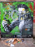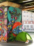 Da Cruz, Mako 93 sont de la partie, co-organisateurs ais-je lu. C’est particulièrement le thème du passage qui a été traité, avec un spot sur les piles du pont métalique ferrovier, qui n’est plus que piéton aujourd’hui ; et une péniche également, entièrement livrée par Mako 93. Une surprise : cette galerie de petites photos mises sous verre et cimentées à même les murs, à bonne hauteur d’yeux, signée Backtothestreet, que je retrouverai dans les rues d’Arles. Ces mini expos méritent le coup d’oeil, elles offrent de beaux et joyeux portraits de groupe, de pied et en décor naturel. Le monde à portée de viseur.