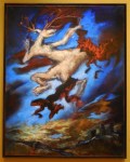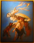 À la demande du musée de la Chasse et de la Nature, Gérard Garouste s’est intéressé au Mythe de Diane et Actéon, l’un des plus beaux qu’ai relaté le poète latin Ovide (43 av. J.C. – 17 ap. J.C.) dans ses métamorphoses : Actéon, chasseur insatiable, s’étant aventuré dans un bois à la recherche de la fraîcheur, surprend la déesse Diane alors qu’elle se baigne nue avec ses suivantes. Lui, simple mortel, ose porter un regard de désir sur la divinité qui se venge en lui jetant un sort. Soudain transformé en cerf, il devient la proie de ses propres chiens qui le mettent à mort.
