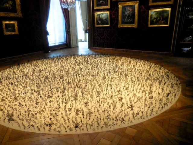 Blackfield de Zadock Ben-David est une installation composée de centaines de fleurs de métal découpées et plantées dans une fine couche de sable. Provenant d’encyclopédies victoriennes du XIXe siècle, ces plantes composent une sorte d’immense toile de Jouy ou de Liberty en trois dimensions. Le travail de l’artiste joue avec la perspective, tandis qu’aver et revers de l’œuvre questionnent la vie et la mort.