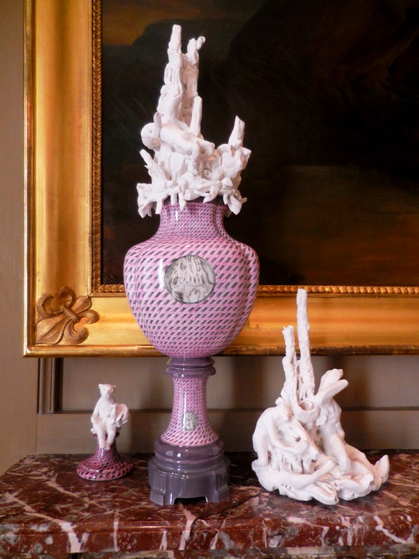 Issues d’une résidence du musée de la Céramique de Desvres , un ensemble d’œuvres en faïence émaillée décline le thème de la forêt. Mais La thématique de l’eau n’est jamais loin de son travail et les formes organiques couvertes d’écailles voisinent avec des condensés de paysages au sein d’installations dont l’artiste laisse à l’observateur le soin d’élucider l’intrigue. L’élément liquide est encore présent, mais canalisé cette fois, dans une tuyauterie proliférant d’où jaillissent des fleurs de glycine. À la Manufacture de Sèvres – Cité de la céramique, Laurie Karp a également conçu un ensemble de sculptures en porcelaine destinés aux salons de peinture du musée de la Chasse et de la Nature. Reprenant les formes, les décors et les techniques issus du répertoire de la manufacture créée à l’initiative de la marquise de Pompadour, elle crée un ensemble faussement rassurant. Elle y perpétue de petits crimes avec humour et férocité, sous couvert d’un décor aux accents rococo. »