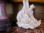 Jouant de l’attraction de techniques associées aux arts décoratifs, Laurie Karp esquisse des scènes déroutantes ou hommes et bêtes entretiennent des rapports ambigus. Sa vision de la nature n’est pas celle d’un Eden immobile et serein. Elle l’envisage plutôt comme une sorte de théâtre tragicomique dont les acteurs seraient animés par le désir et la faim. Leurs étreintes mortelles, leurs luttes bec et ongles, elle les voile sous l’apparence charmeuse de la céramique ou de la broderie. C’est dans cet esprit qu’elle a conçu l’essentiel des pièces créées pour l’exposition au musée de la Chasse et de la Nature.