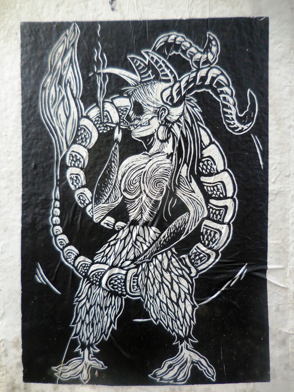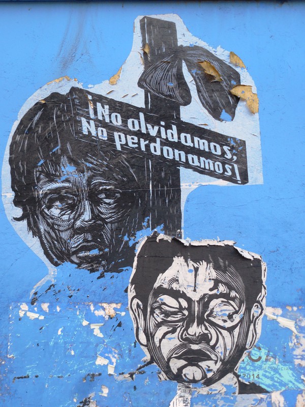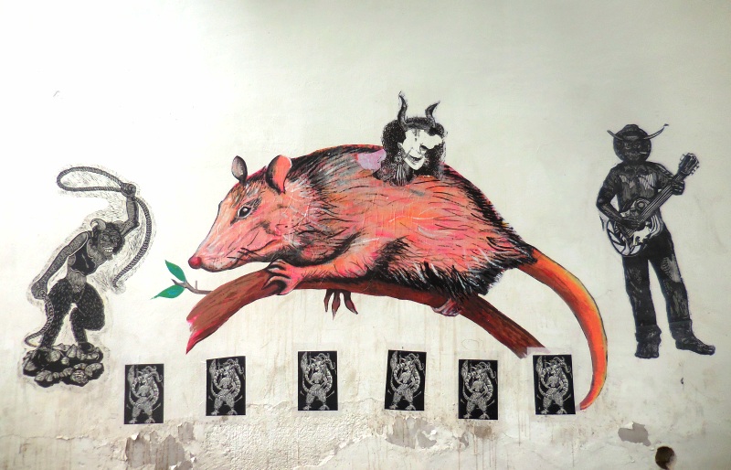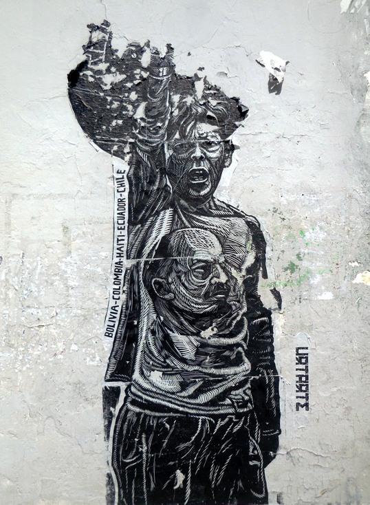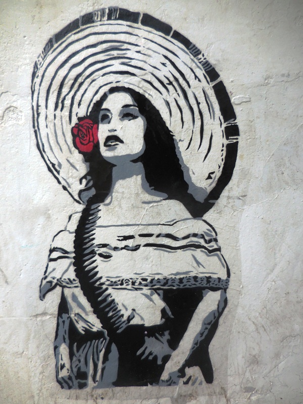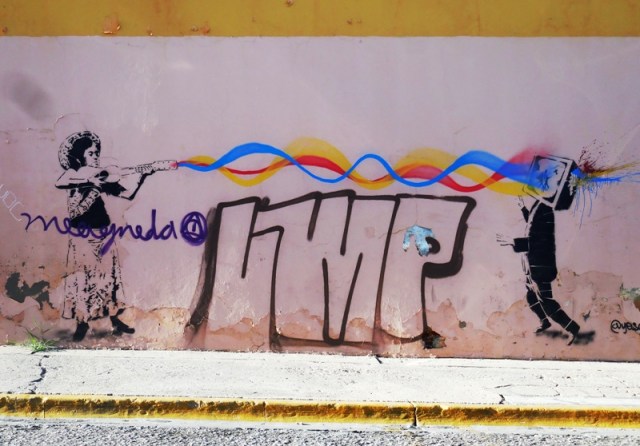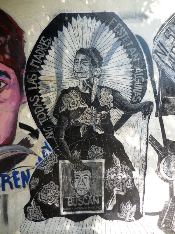 Voilà une deuxième sélection d’oeuvres street art, plus graphiques et récentes. La gravure continue de s’exposer sur les murs de la ville de Oaxaca, ce qui est d’ailleurs devenu partie intégrante de la « marque » Oaxaca. Les services touristiques ont su s’approprier l’esprit politico-artistique rebelle datant des émeutes de 2006, pour vendre un paquet all inclusive aux visiteurs étrangers avides de culture locale, qui marie habilement la culture institutionnelle (les nombreaux musées d’art et d’archéologie), artisanale de luxe (les ateliers d’alebrijes et de céramique dans les environs de la ville), avec les expressions plus rebelles qui sont constamment rafraîchies par les collectifs de gravure ou des artistes indépendants, dans le centre historique,