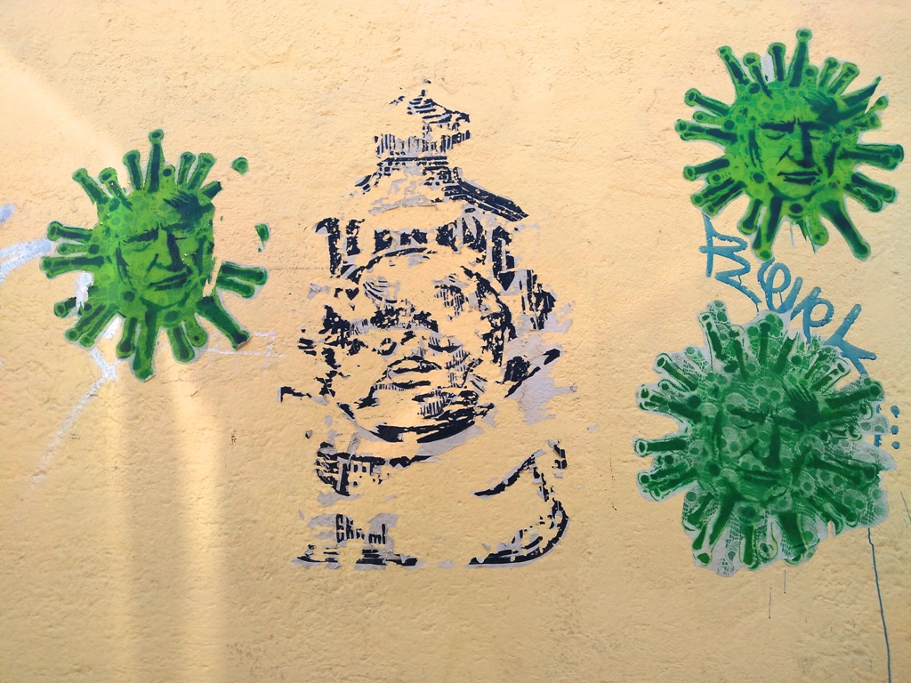Avec leur sens habituel de l’humour et de la dérision, ajouté à la distanciation que leur permet à la fois leur culture plurimillénaire et la proximité de la culture occidentale incarnée par leur grand voisin étasunien, les artistes mexicains, et particulièrement oaxaqueños, ont repris à leur compte le thème du sacrifice 2020-2021 de la Coronafolie. On en voit un exemple avec les détails de cette belle fresque murale, présidée par le dieu aztèque de la mort Mictlantecuhtli, et qui illustre ce texte plus haut. Sur les murs de La Máquina Taller de Gráfica, en face de Santo Domingo s’affichent également d’autres œuvres en relation avec l’épidémie de Covid, évolutives au fil du temps : collages, peintures, gravures (voir Le festival des masques). L’usage du couvre-bouche est appliqué jusque sur cette piñata en forme de Coronavirus, consciencieusement copiée de la modélisation scientifique et qui en respecte même les nuances numériques vertes et rouges. Étrange forme étoilée qui brille dans la nuit de nos projections, présente un peu partout sur les murs du centre-ville désormais, et prenant l’apparence d’un visage humain : celui du quidam ou de Big Brother, c’est égal puisque tout le monde est sensé surveiller tout le monde…