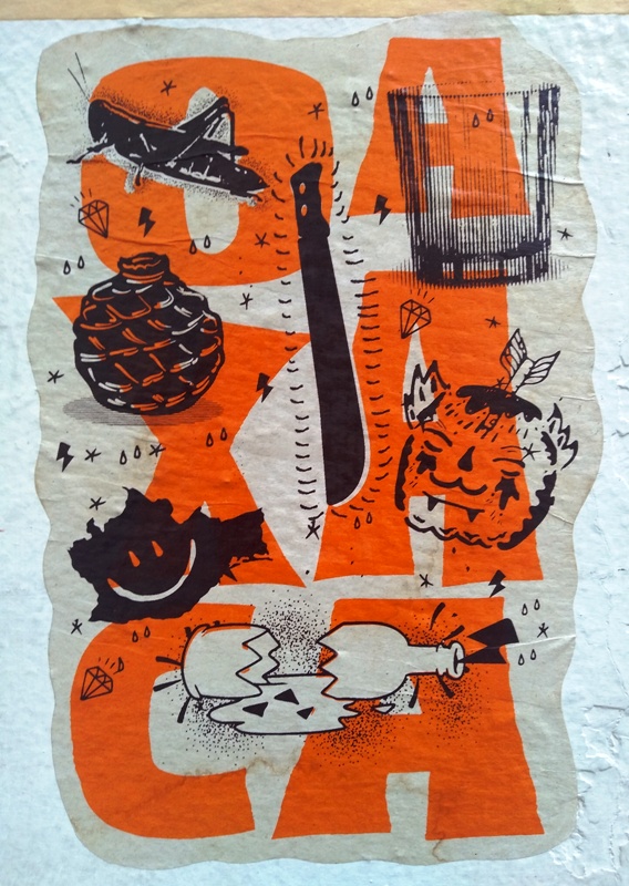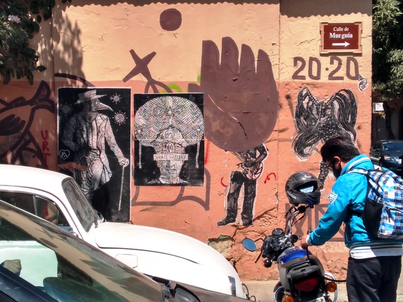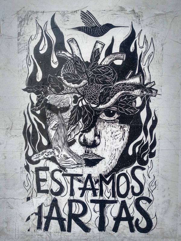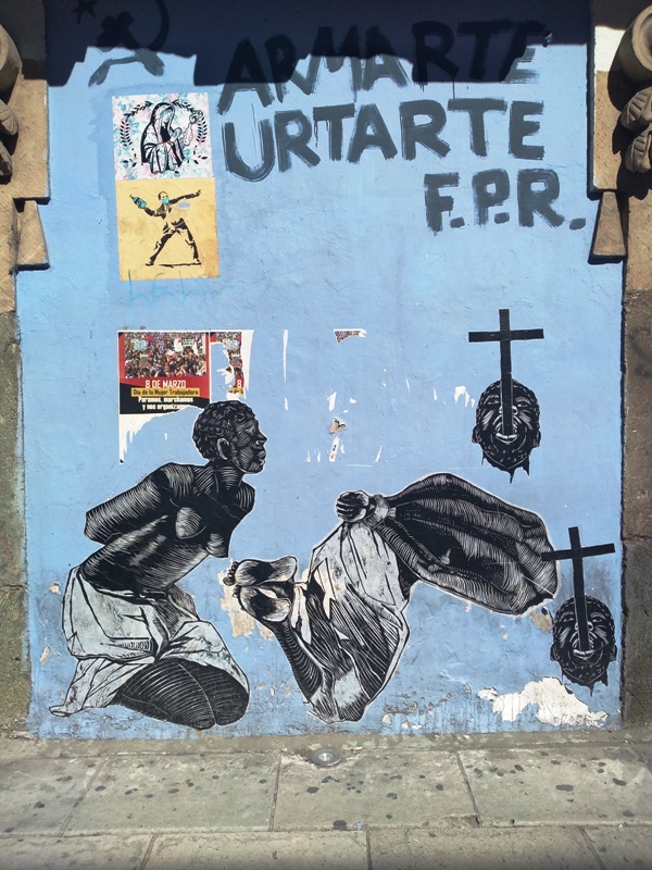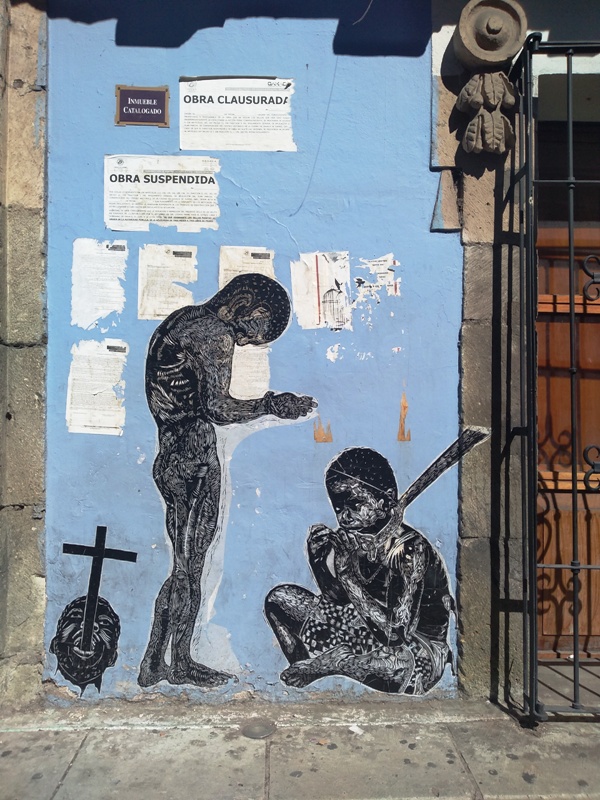 Cependant si des espaces ou collectifs artistiques ferment leurs portes, les murs se sont animés de nouveaux messages visuels, parfois décoratifs, reprenant encor le thème de la défense des cultures locales mais souvent en relation avec la situation vécue : vestiges du Benito Juarez masqué, 500 ans d’esclavage, des gravures, de la peinture à la bombe, au pinceau, des collages et photographies… voici une première sélection d’oeuvres graphiques, avec URTARTE, Tupac, Akun Takil, Teak et d’autres artistes, locaux ou de passage.