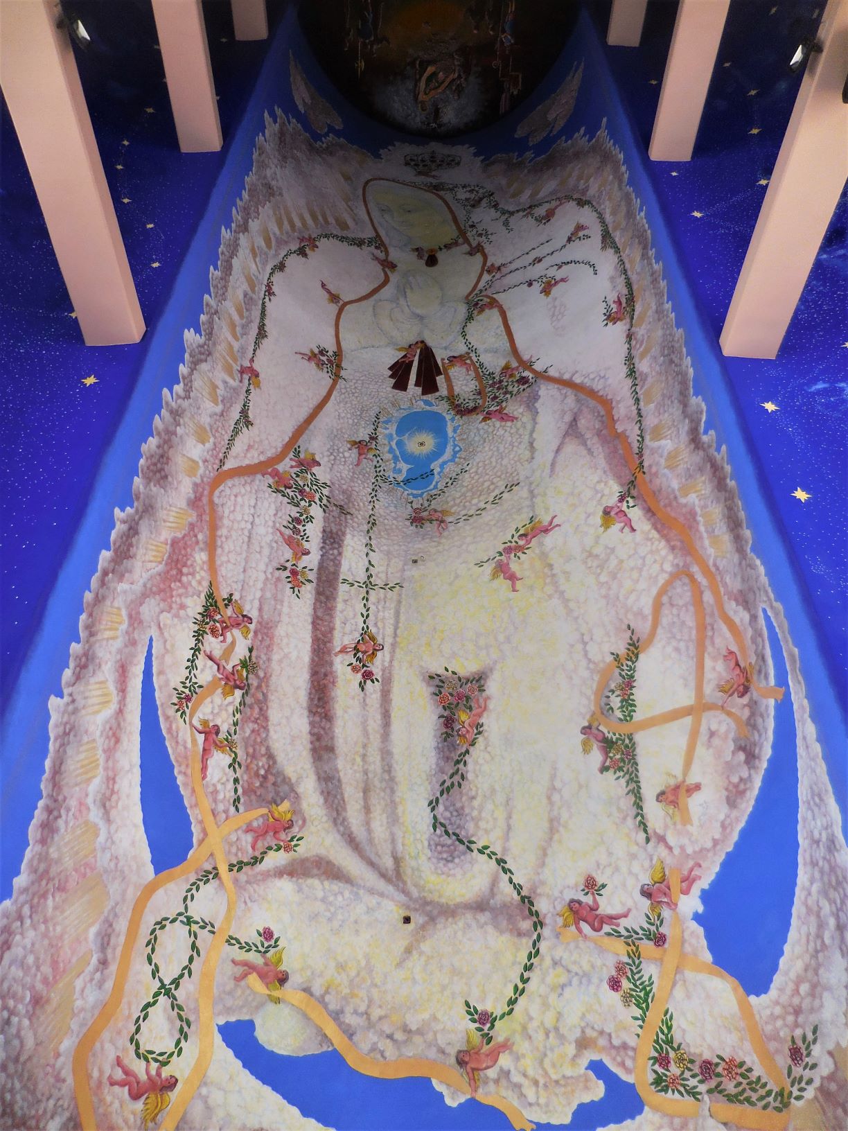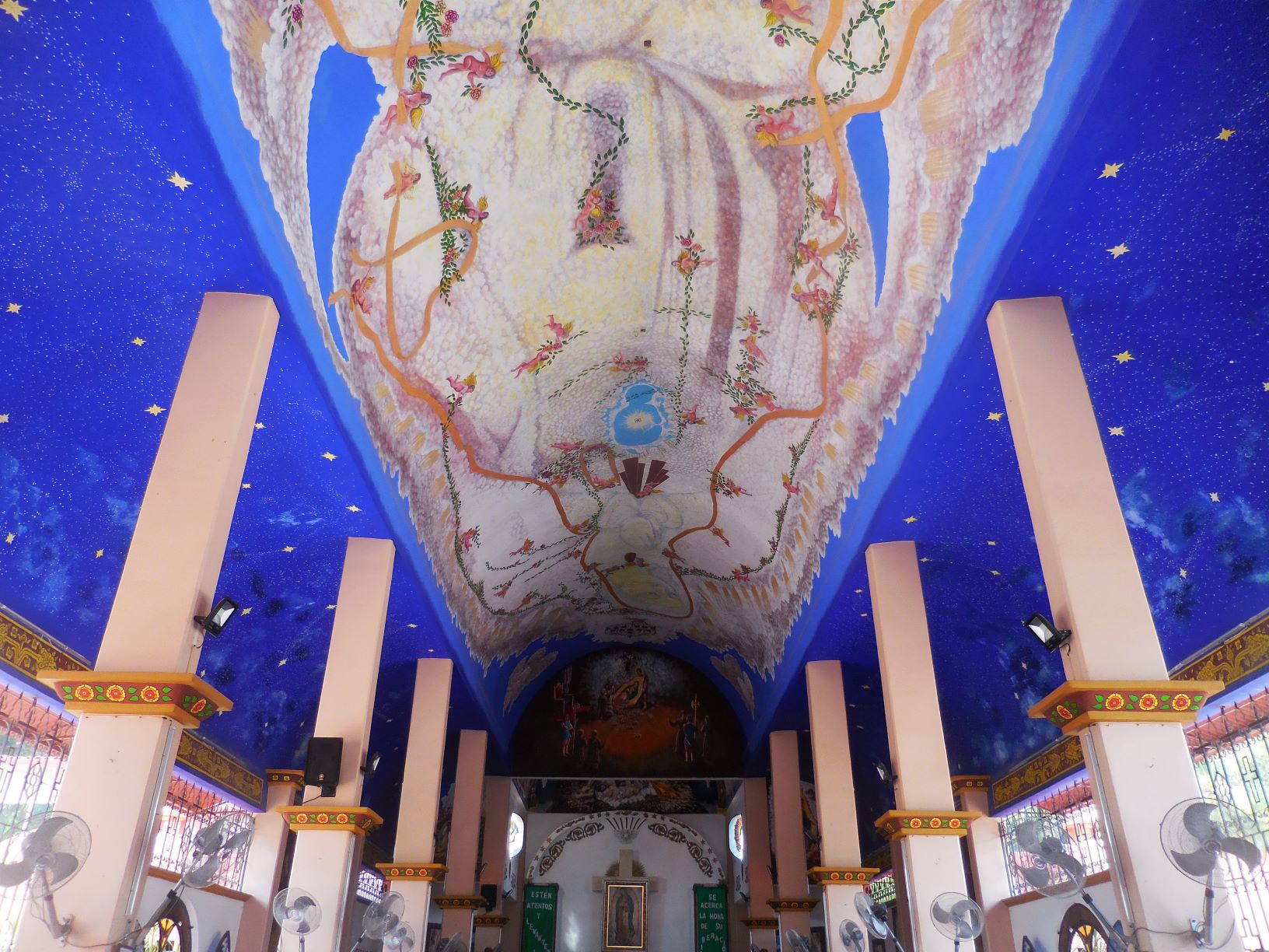 Si vous visitez un jour Bahías de Huatulco, n’hésitez pas à faire un tour dans l’église qui jouxte le zócalo de La Crucecita, épicentre commercial et noyau de la zone touristique et résidentielle. Non pas pour y faire une pause fraîcheur – la chaleur et l’humidité permanente s’engouffrent partout sur la côte pacifique de Oaxaca au Mexique, ce qui n’empêche pas de s’y assoir sur un banc et méditer ou faire une prière – mais pour contempler une oeuvre unique : Homenaje a la Virgen de Guadalupe según la Cosmovisión Indígena del siglo XVI (Hommage à la Vierge de Guadalupe selon la Cosmovision Indigène du XVIe siècle). Longue de 20 mètres, et large de 5 mètres environ, cette fresque est peinte sur la voute de l’église moderne aux allures baroques, sachant que La Crucecita a été fondée lorsque le tourisme a commencé à se développer sur cette partie de la côte dans les années 1980, sous l’impulsion de la FONATUR.