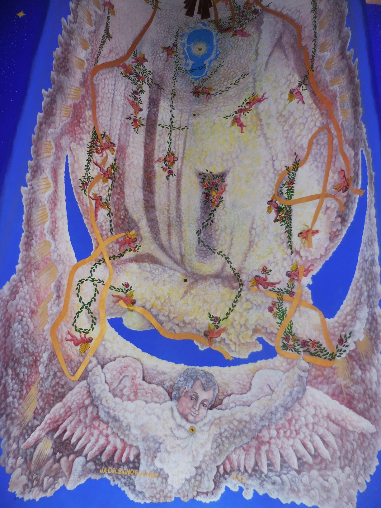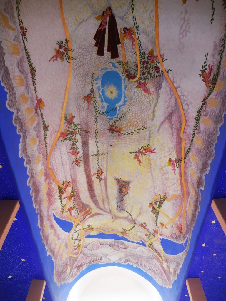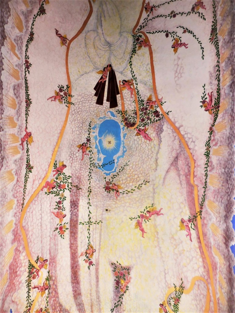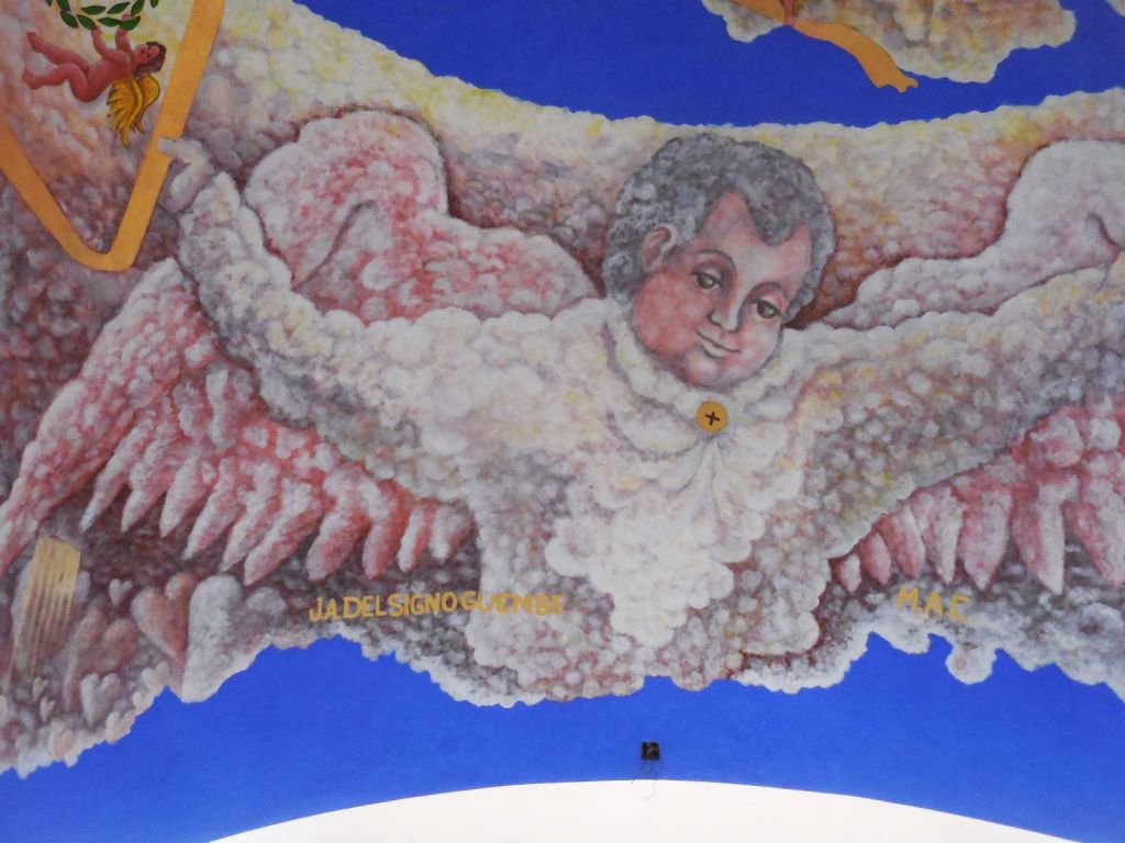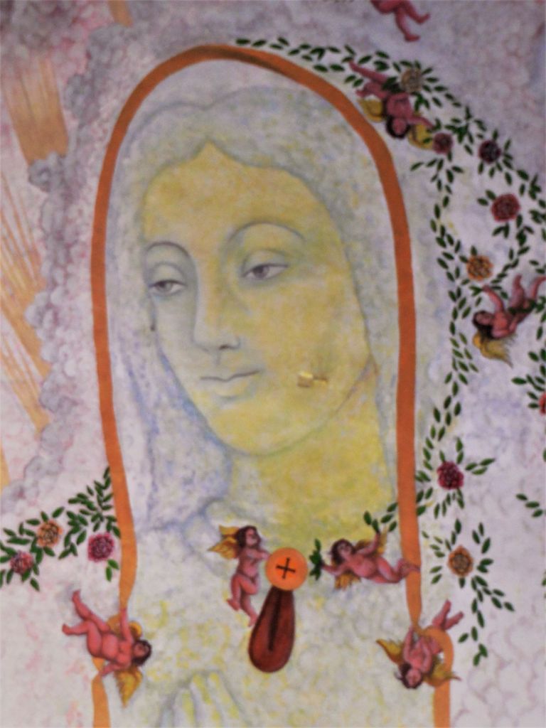 La Vierge de la Guadalupe étant la grande patronne des Mexicaines et Mexicains (lire La Vierge de Guadalupe dans tous ses états) elle y méritait donc un hommage à sa dimension et digne de sa renommée. Celle qui habite la petite église du zócalo semble planer à une dizaine de mètres du sol, telle un gigantesque Bouddha céleste au féminin, une Bodhisattva toute en grâce et retenue, soutenue par des angelots naturistes. La touche et la gamme colorée de l’artiste “conceptuel et symboliste” Pepe del Signo, allant du bleu au jaune-orangé et ocre-rouge en passant par le blanc, confèrent à cette peinture un charme vaporeux inégalé, qui se combine parfaitement avec le climat tropical, les cascades colorées de fleurs alentour et le ciel souvent azur qu’offre la côte de Oaxaca.