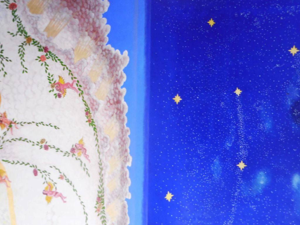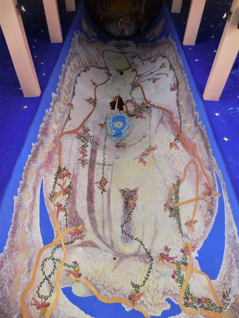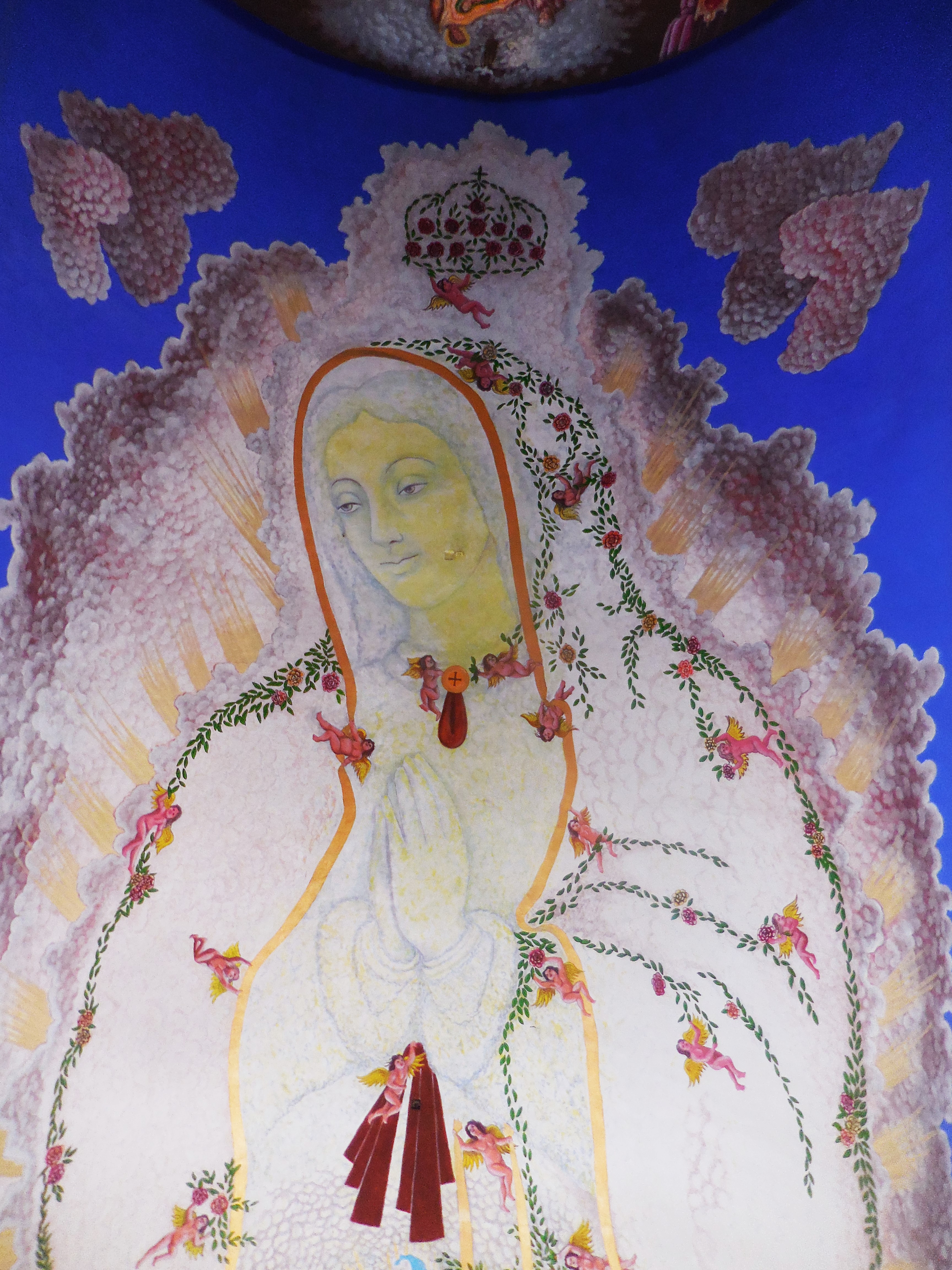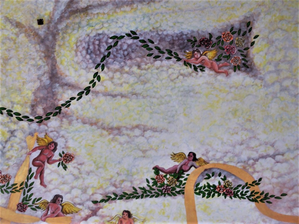 La Vierge de la Guadalupe étant la grande patronne des Mexicaines et Mexicains (lire La Vierge de Guadalupe dans tous ses états) elle y méritait donc un hommage à sa dimension et digne de sa renommée. Celle qui habite la petite église du zócalo semble planer à une dizaine de mètres du sol, telle un gigantesque Bouddha céleste au féminin, une Bodhisattva toute en grâce et retenue, soutenue par des angelots naturistes. La touche et la gamme colorée de l’artiste “conceptuel et symboliste” Pepe del Signo, allant du bleu au jaune-orangé et ocre-rouge en passant par le blanc, confèrent à cette peinture un charme vaporeux inégalé, qui se combine parfaitement avec le climat tropical, les cascades colorées de fleurs alentour et le ciel souvent azur qu’offre la côte de Oaxaca.