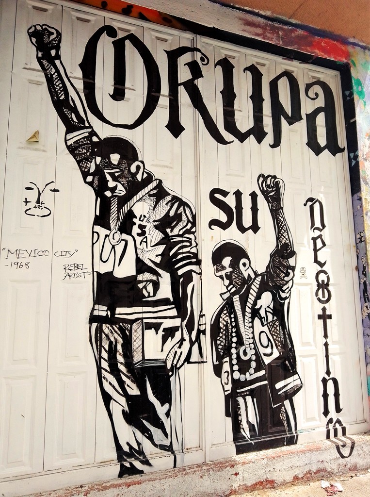 OKUPA SU DESTINO – Black Power / Hommage au geste de résistance des athlètes étasuniens noirs sur le podium des médailles, en soutien à la lutte contre l’apartheid aux USA, jeux Olympiques de Mexico 1968 – Oaxaca street art 2021