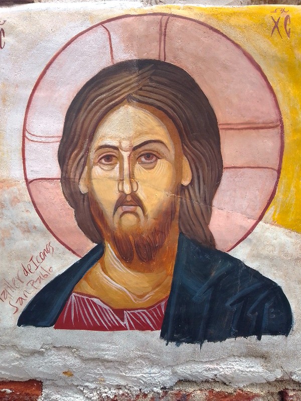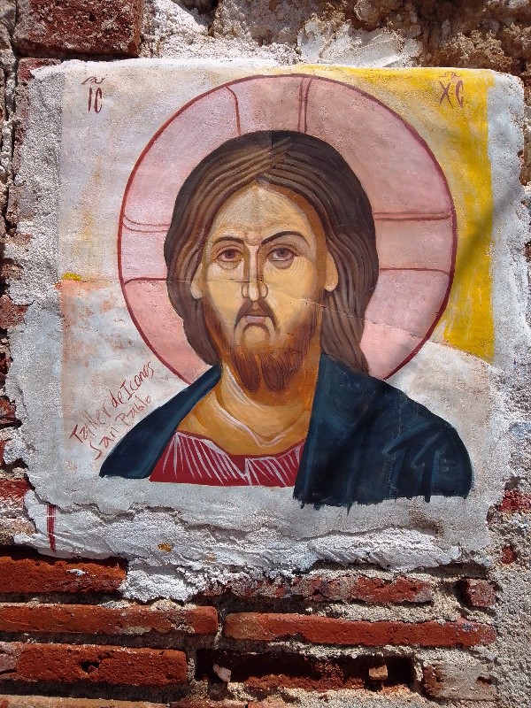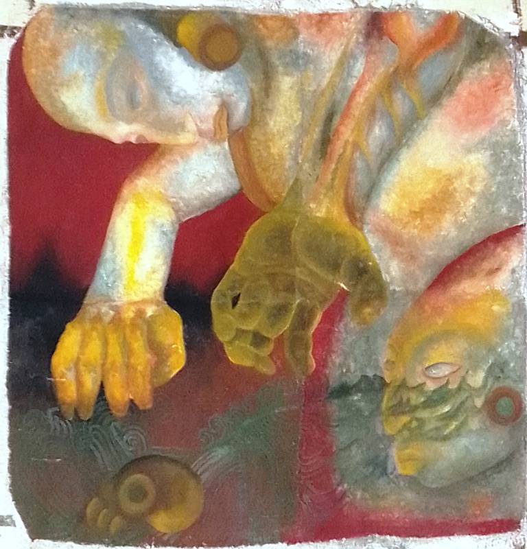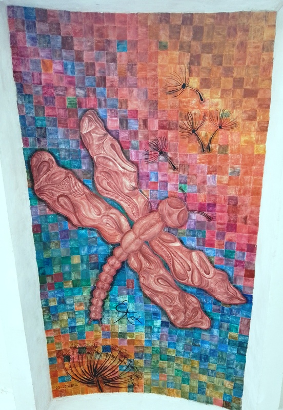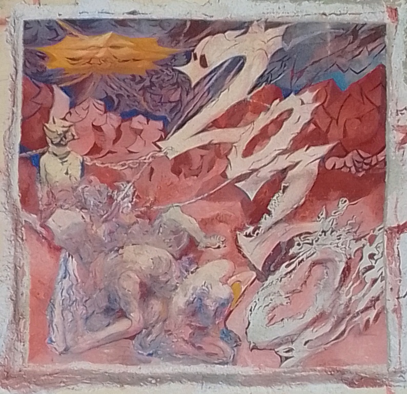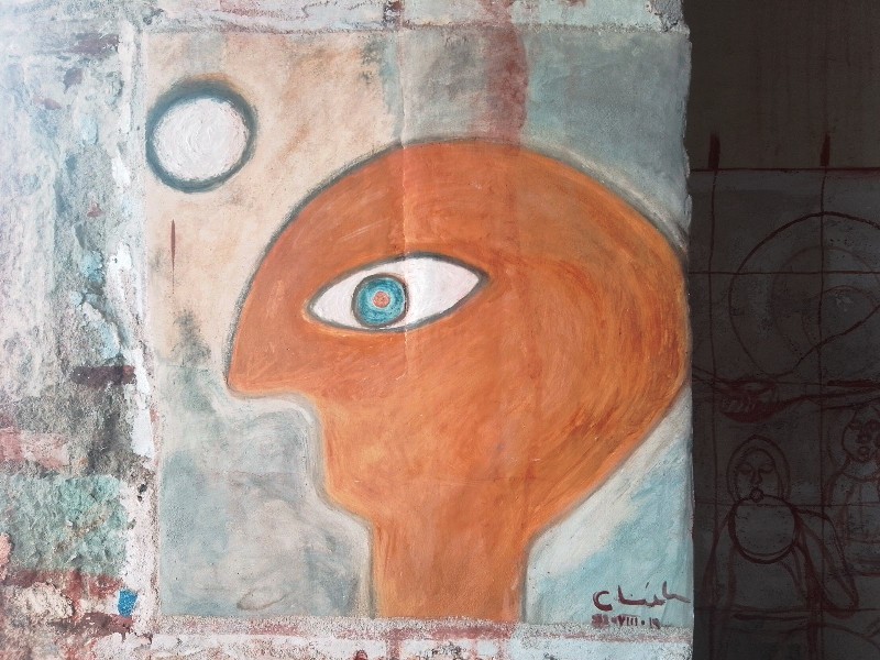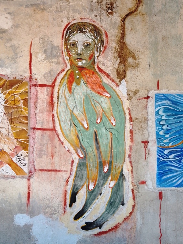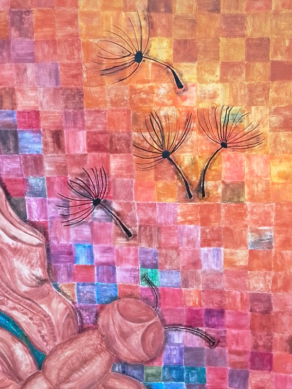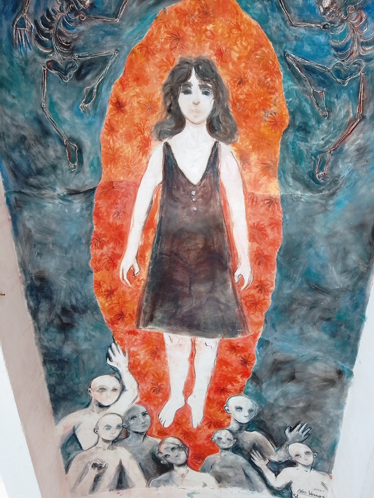 Je choisis cette œuvre parce qu’elle n’a pas eu besoin de croquis, elle est très libre et spontanée, il y a beaucoup de liberté et de sécurité pour la réalisation. C’est l’image d’un enfant-ange, un séraphin non encadré, qui va s’envoler. Forme avec Frida Kahlo sur sa gauche, et un ange sur sa droite, unit groupe de gardiens artistiques et spirituels, sont les veilleurs de l’endroit avec l’icône du Christ sur le mur opposé.