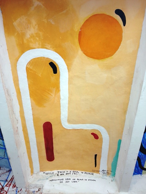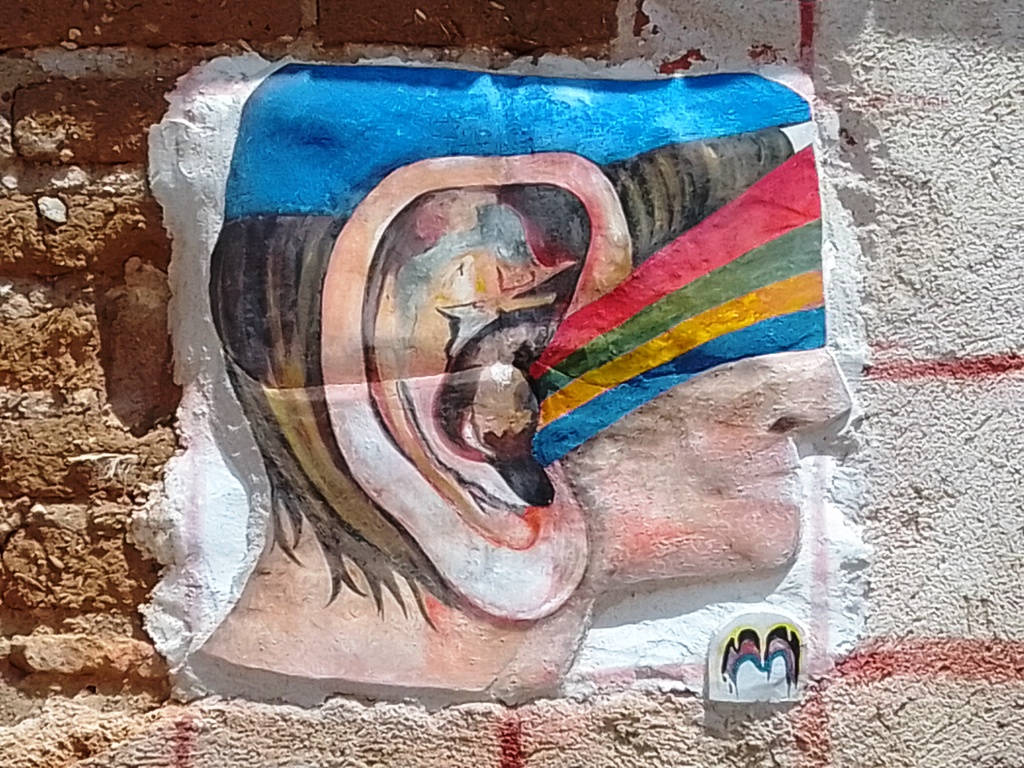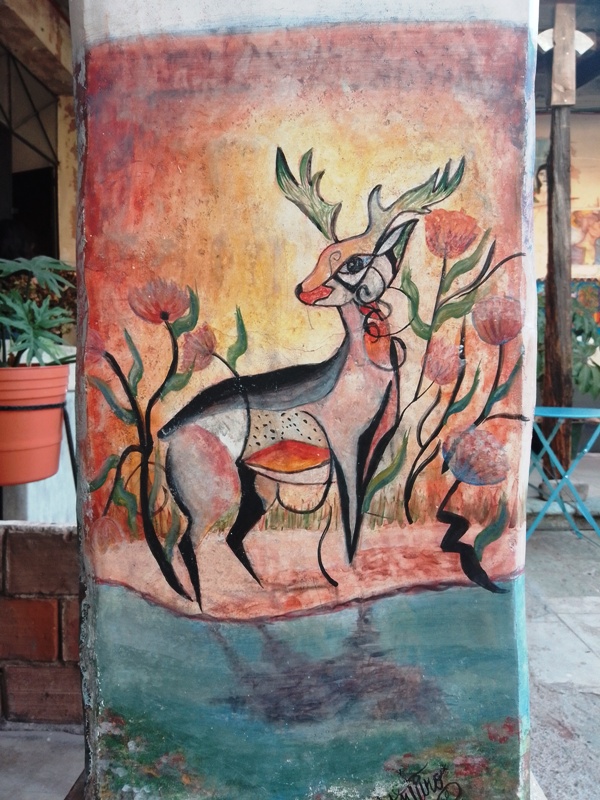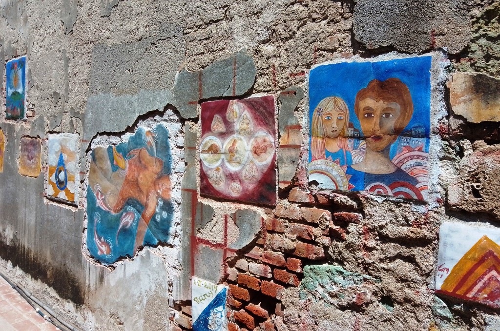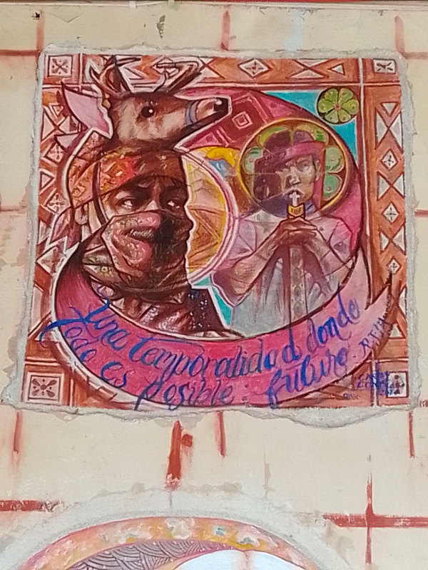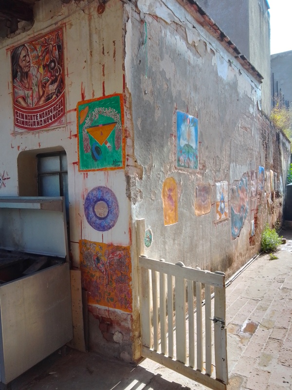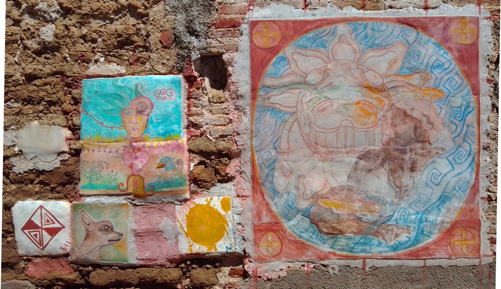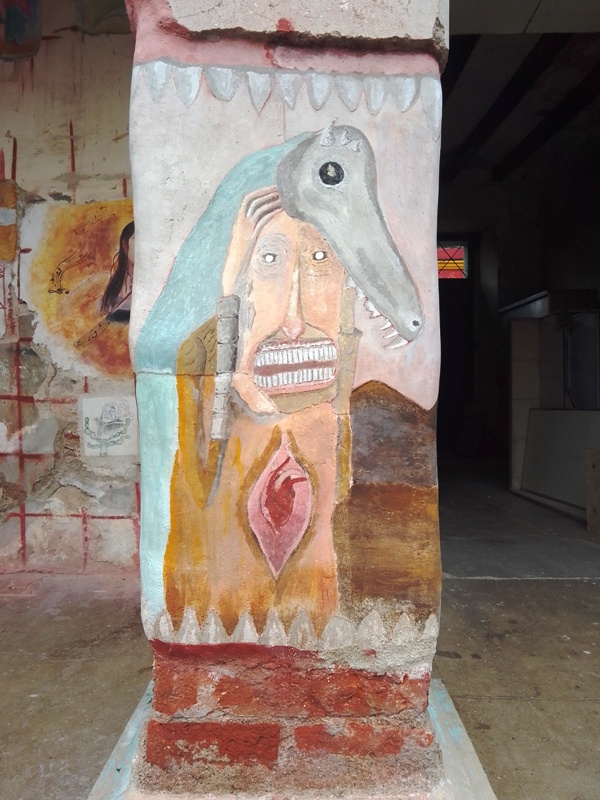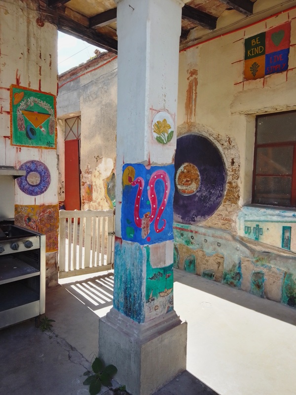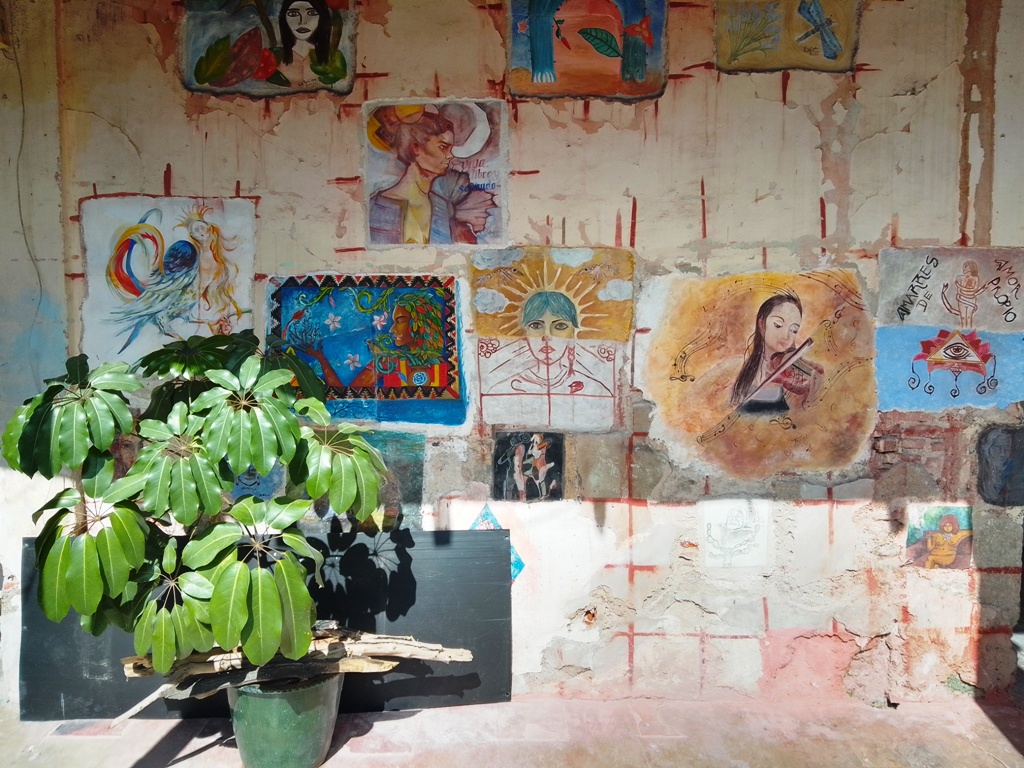 C’est dans un magnifique espace atemporel lové au centre-historique de Oaxaca que se trouve l’Espacio artístico Xicotencatl, dans la rue du même nom : une ancienne propriété de plain pied, à l’origine entièrement construite en adobe ou terre crue. Elle s’articule autour de deux patios, dont le plus grand et le plus discret, au fond d’un passage de bric et de broc, accueille divers artistes et ateliers , comme celui du peintre Gabriel Mendoza. Dans ce collectif s’est aussi installée la Escuela de muralismo de Oaxaca, que dirige Jesús Gutiérrez depuis maintenant 10 ans. Les exercices et œuvres, toutes les réalisations effectuées lors de différents stages de formation se développent dans toute la bâtisse, comme des fenêtres ouvertes sur de multiples imaginaires. Les curieux peuvent y découvrir progressivement des espace-temps envoyant des messages personnels très divers.