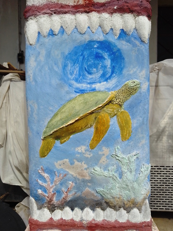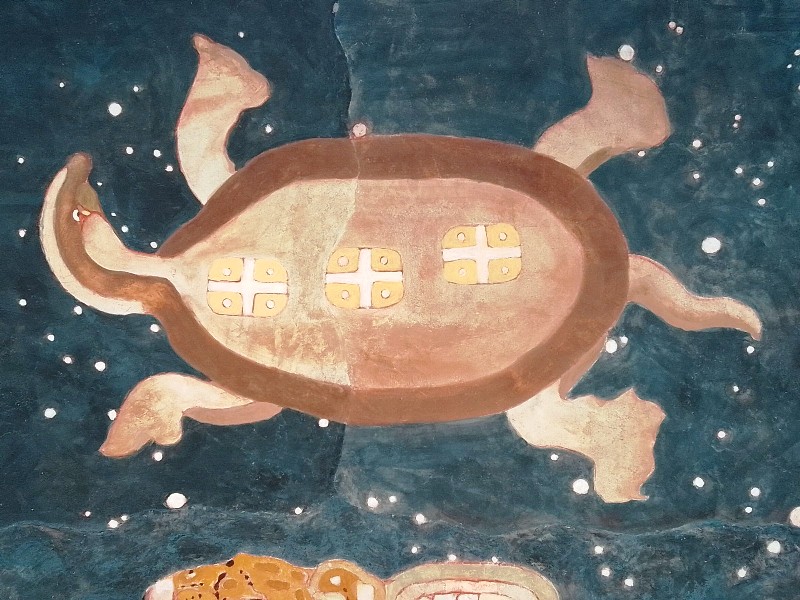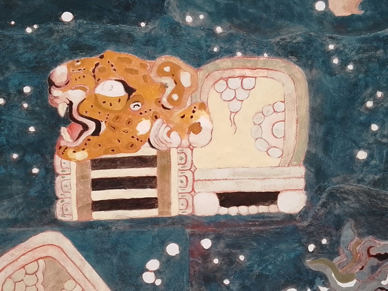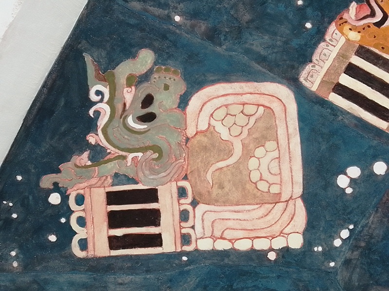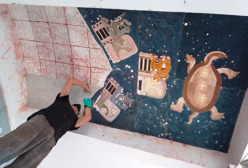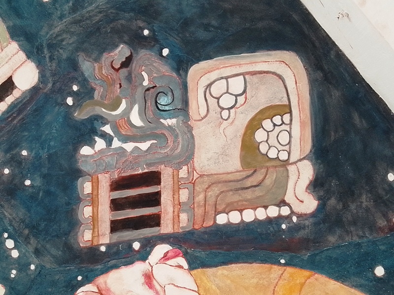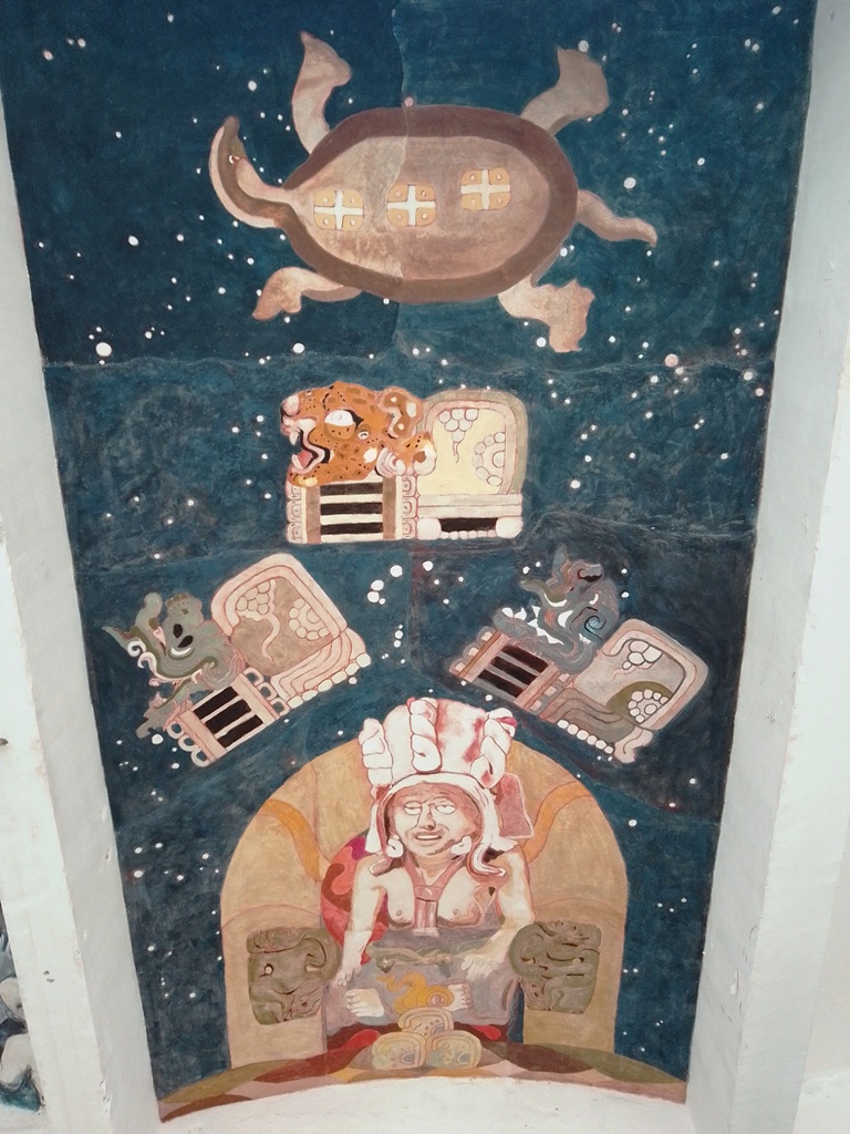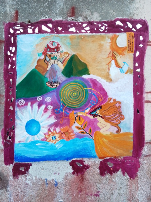 L’artiste d’origine maya a souhaité représenter une cosmovisión. Il a reproduit le dessin oriinal de 3 pierres sculptées, découvertes dans son village natal guatemaltèque. Celles-ci ´étaent utilisées comme support à des récipients pour préparer la nourriture et qui symbolisent donc le foyer. Elles sont en résonance avec la déesse maya aux seins nus et aux offrandes, et avec une tortue- signe supportant les trois pierres simplifiées. Ce sont les trois étoiles les plus lumineuses de la constellation du Centuron d’Orion.