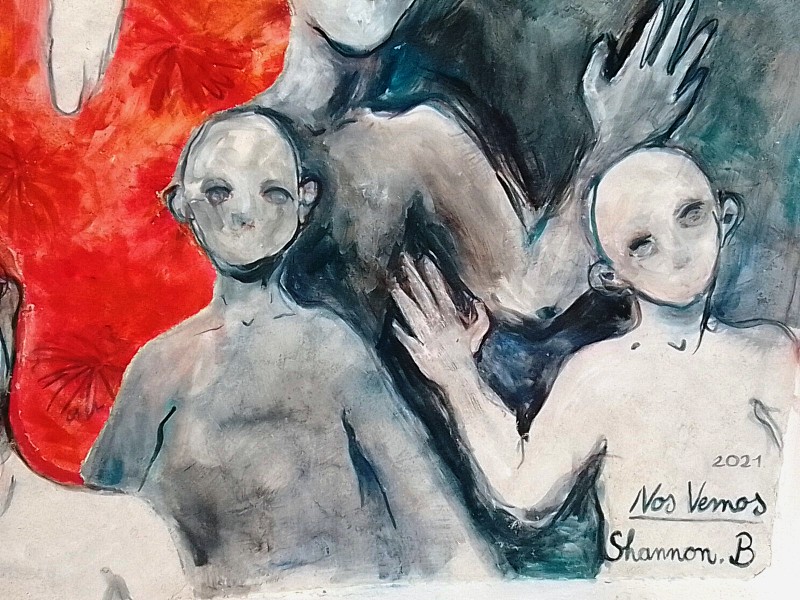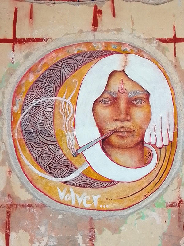 Shannon, fraîchement diplômée en art mural à ENSAAMA de Paris, a particulièrement aimé durant son séjour 6 mois cette expression de prise de congé, nos vemos, qui est aussi vague que mañana (demain) mais toujours chaleureuse. En plus de la belle portée initiatique de cette oeuvre, on admirera sa facture avec de beaux effets de patine, ainsi que la qualité du graphisme et la palette de couleurs.