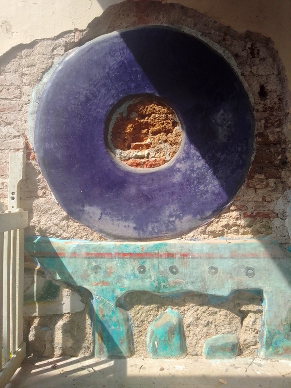 Maintenant, je vais commenter le processus. Tout d’abord, vous devez préparer le mur : piquer, étudier l’état. Pour appliquer la peinture à base de pigment naturel, il doit être sain, pas de fissures, pas d’humidité, Cela dépend aussi de si vous avez du ciment, peinture acrylique. Parfois, il faut le restaurer avant de l’appliquer. Dans cet espace, nous avons la chance d’avoir à disposition tous les types de support pour les peintures murales : adobe, brique, béton…