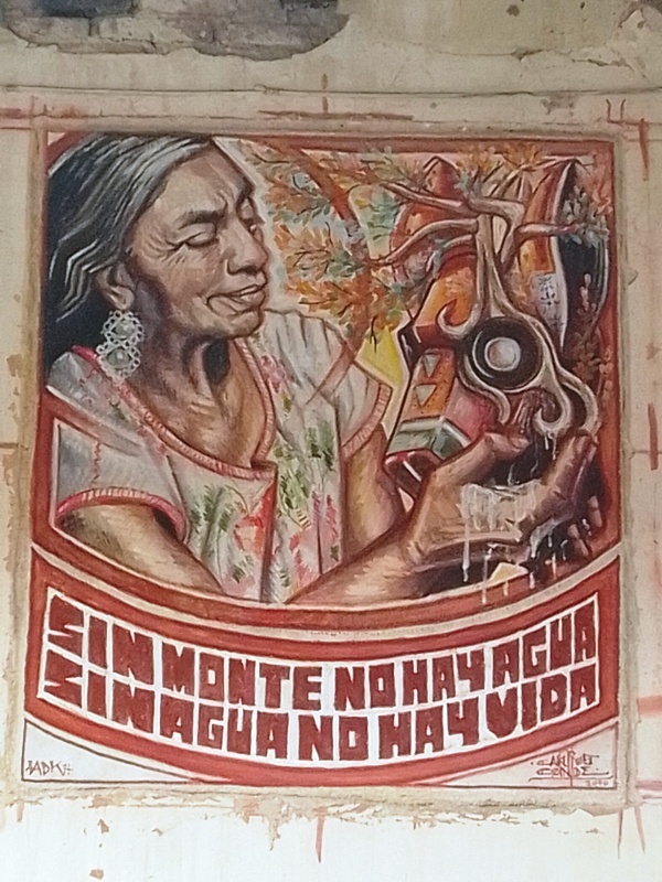 Le maître Jesús González Gutiérrez est le fondateur et le directeur de l’École de muralisme de Oaxaca. L’artiste se spécialise dans la peinture murale à fresque ainsi que d’autres techniques naturelles et organiques. Il se concentre principalement sur des techniques préhispaniques et des matériaux durables et biodégradables, comme le cinabre qui donne un rouge chaud. La technique du frais est appliquée sur les murs, les plafonds, même les panneaux élaborés avec un mélange de chaux, de sable et de fibre de coco. À Jalisco où le maître a grandi, la noix de coco est très utilisée comme boisson et sa fibre se trouve en grande quantité pour le recyclage.
