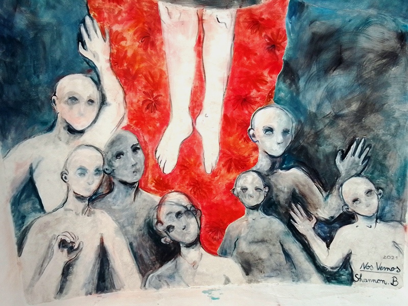 On peut donc voir dans cette oeuvre profonde une forme de recueillement et même de deuil, la mise en scène macabre d’un dernier regard lancé derrière soi, inaugurant d’un départ vers un ailleurs, vers autre chose. Pareille à l’alter ego de l’artiste, une jeune femme ni triste ni gaie se repose sur un sol qui est aussi le cosmos, les abîmes, et se laisse glisser dans la quête de soi ; elle laisse fuir des images, des personnes, des souvenirs du passé, dans l’acceptation d’une fin et l’espoir d’une renaissance.