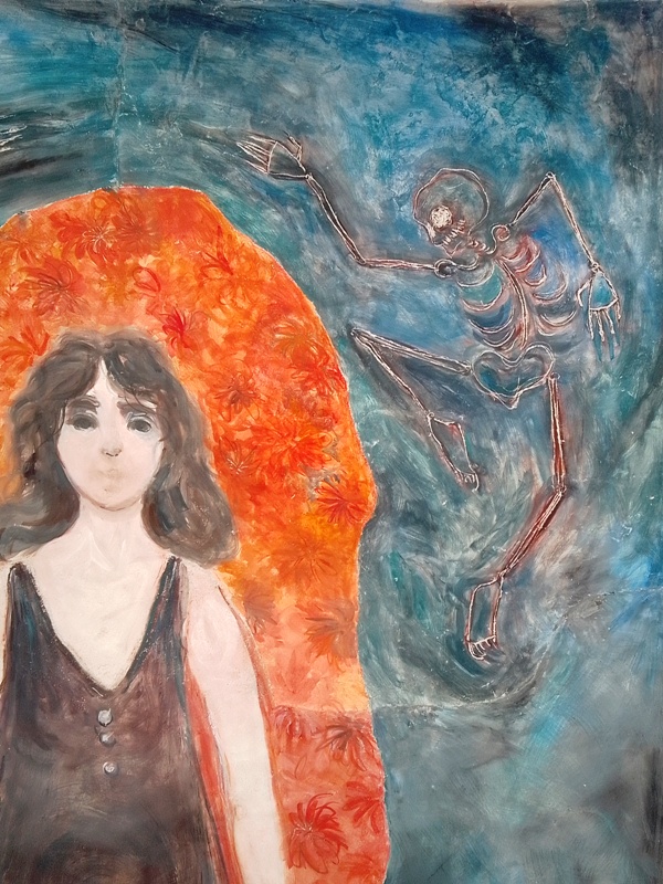 Une très jeune femme vêtue d’une robe noire est allongée sur un tapis rouge-orangé constitué de fleurs de Cempasúchil, traditionnellement utilisées dans les cérémonies mexicaines lors de la fête des morts. Le fond bleu pétrole représente des nuées dans lesquelles on distingue, gravés dans le stuc tels des fossiles, deux squelettes dansant et souriant situés l’un à gauche, l’autre à droite du visage de la jeune fille. À ses pieds, un groupe de personnages blancs, aux traits indéfinis et sans bouche, un peu comme des spectres mais dont les regards bienveillants et enfantins, la gestuelle semblent dire “au revoir” ou “adieu et bonne chance” à la jeune fille.