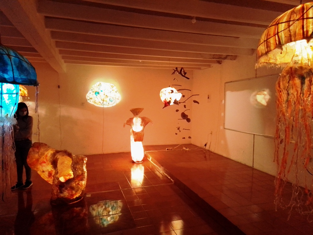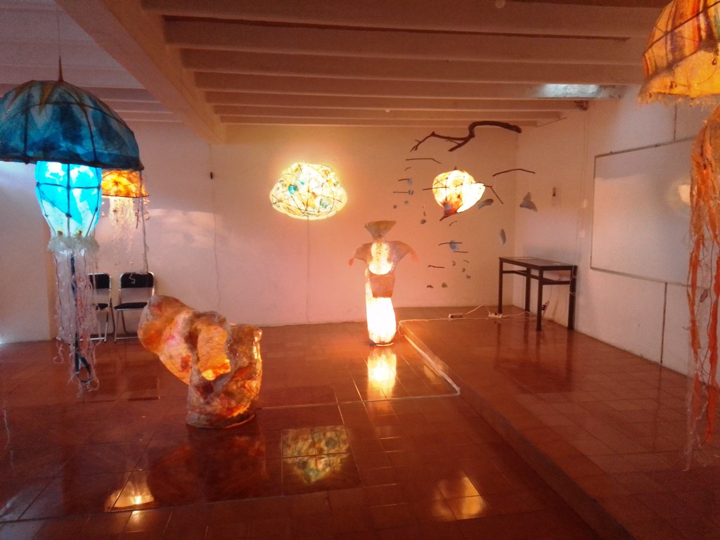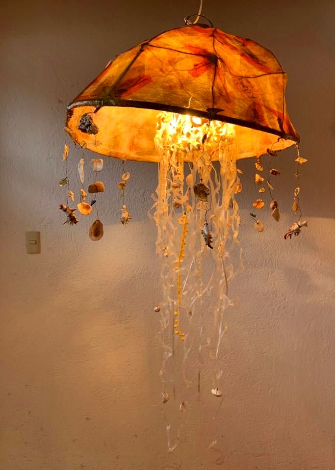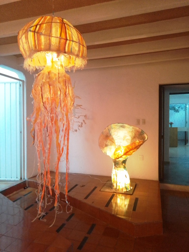J’ai commencé à m’intéresser aux lampes et installations lumineuses à Zacatecas en 2013. Tout d’abord inspiré par les éléments terrestres et aériens de mon environnement proche (cactus, nuages, le paysage semi-désertique de la région étant déjà fantasmagorique), les éléments marins tels les coquillages, les méduses, les barques, les coraux, les tortues sont devenus progressivement des références à mes Formas de luz. Puis les fleurs et plantes tropicales ou sylvestres, en arrivant à Oaxaca il y a 4 ans.