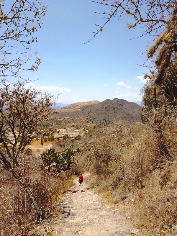 Depuis la route fédérale qui part de Oaxaca et passe par Tlacolula, un embranchement d’environ un kilomètre mène pratiquement tout droit au site, logé dans les contreforts de la montagne avec une vue imprenable sur la vallée. C’est la Dame en rouge qui nous ouvre le passage pour Yagul et nous accompagne le long de cette promenade dans un paysage grave, à la fois romantique et un peu sombre, sec, dense et fluide, mi-solaire, mi-lunaire.