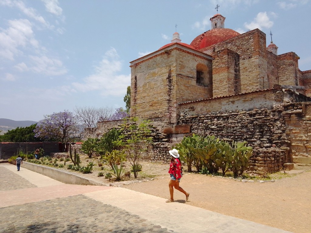 J‘ai retrouvé l’ambiance mi-lunaire, mi-solaire, mystique et un peu désolée de Mitla que j‘avais perçue alors en 2011, quand j‘ai rapidement visité le site archéologique pendant un itinéraire touristique complet d’une journée entière dans la vallée. Nous avions relié en camionnette avec un petit groupe de touristes de différentes nationalités Oaxaca de Juárez, l’arbre du Tule, la zone préhispanique de Mitla, Teotitlan del Valle et ses tisserands, une palenque de mezcal avec dégustation, pour finir par un manifique coucher de soleil à Hierbe el Agua.