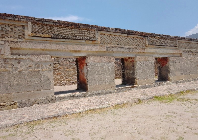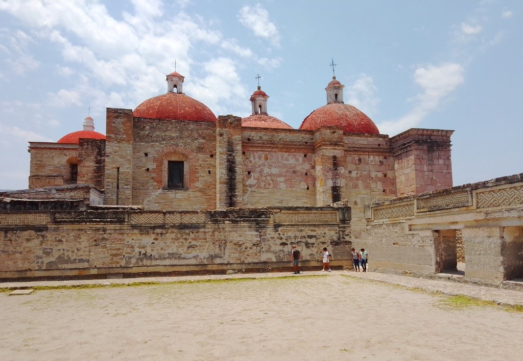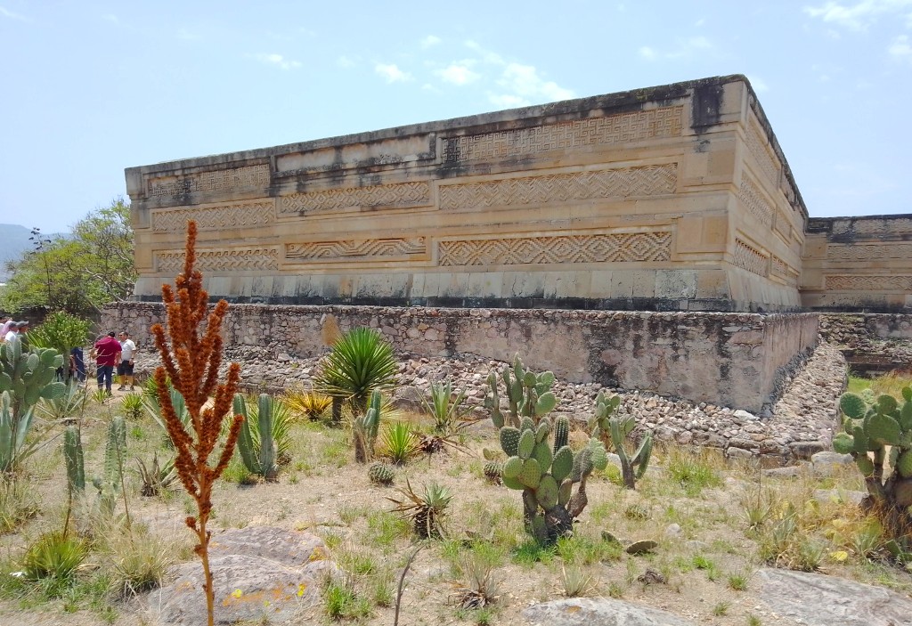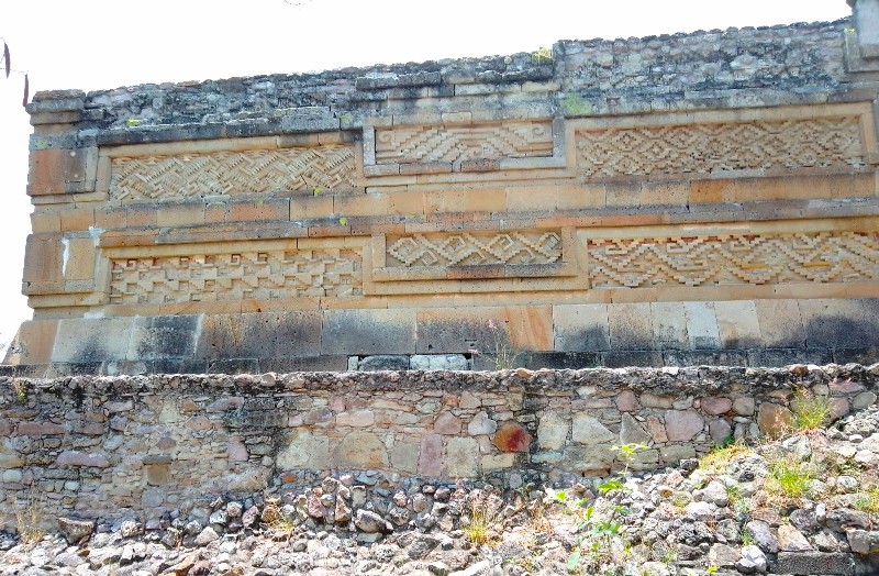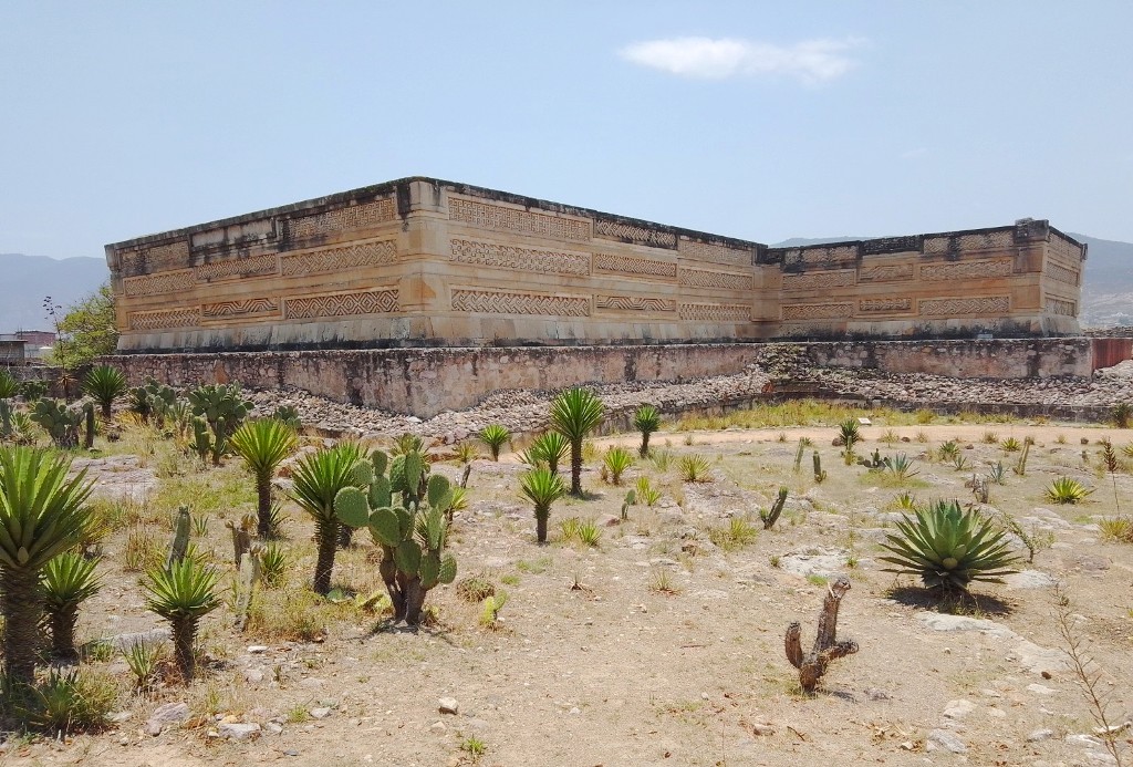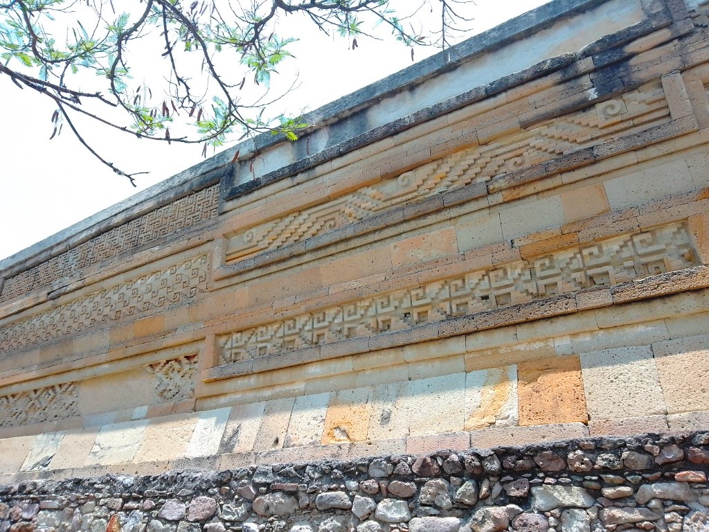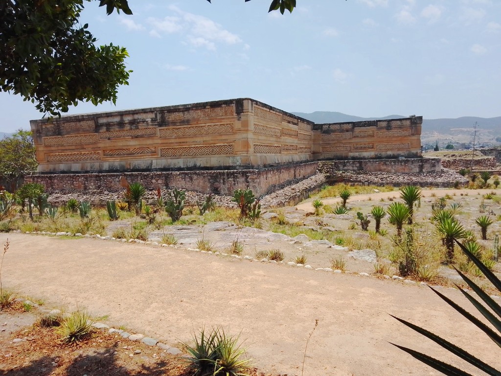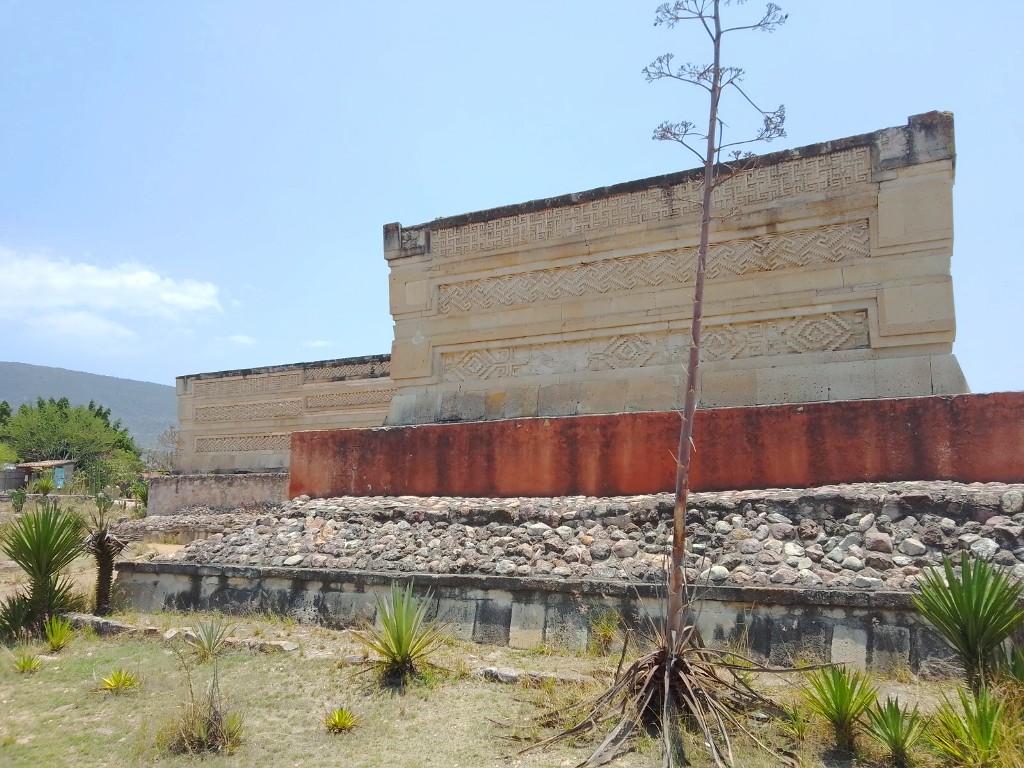 Mitla, qui a atteint son apogée entre 950 et 1521 après J.C. se caractérise par ses formes architecturales horizontales très géométriques, presque futuristes, et est devenue un must de l’activité touristique de Oaxaca, avec Hierbe el Agua situé plus en hauteur au sud-est de la ville. On remarquera ci-dessus, dans le Grupo del Arroyo (comme pour tous les autre édifices du site) les angles du batiment légèrement obliques, donnant avec l’effet de perspective, une forme trapezoïdale inversée.