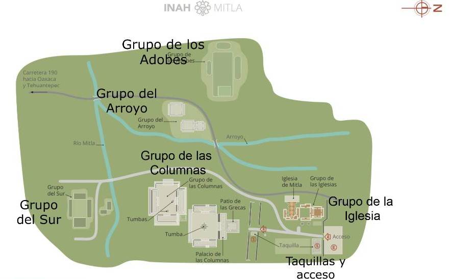 La zone de Mitla est le deuxième centre cérémoniel le plus important de l’État de Oaxaca après Monte Albán. Celui-ci se trouve à l’occident ou poniente de la capitale régionale Oaxaca de Juárez, tandis que Mitla se situe à l’orient. Elle compte plusieurs groupes de constructions, dont celui des colonnes situé à côté de l’église baroque, construite au début de la colonie espagnole.