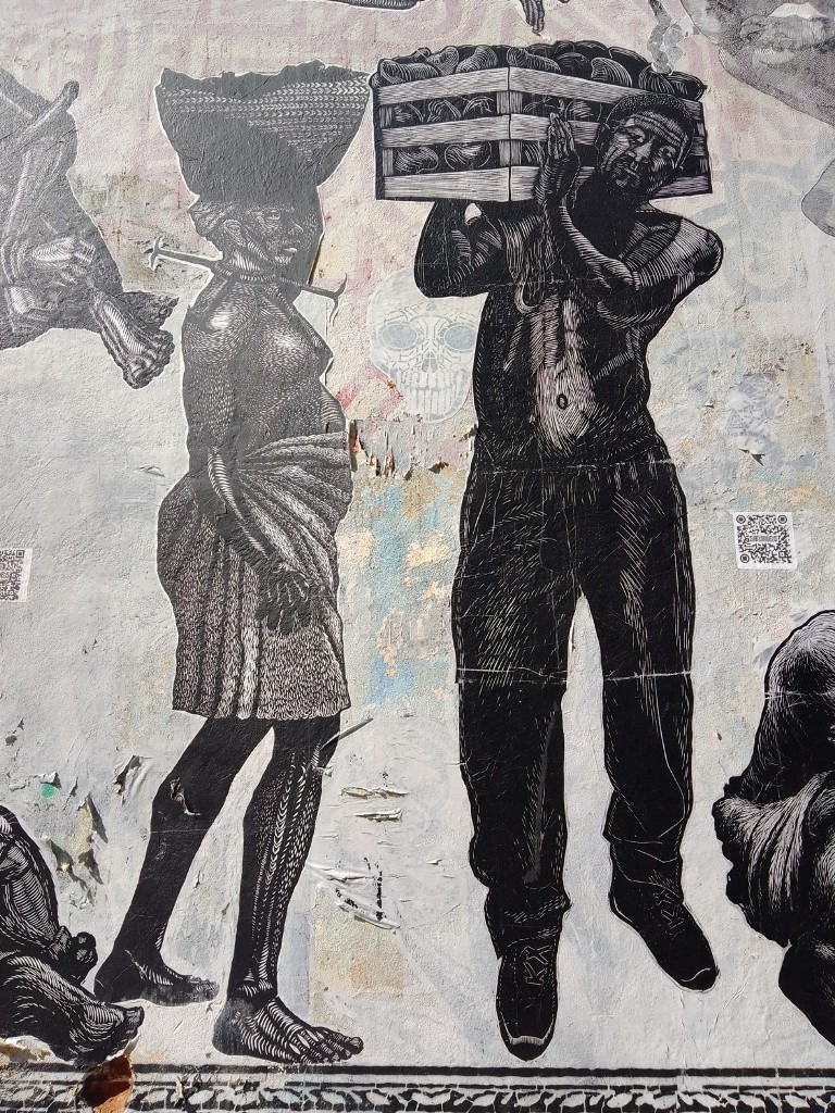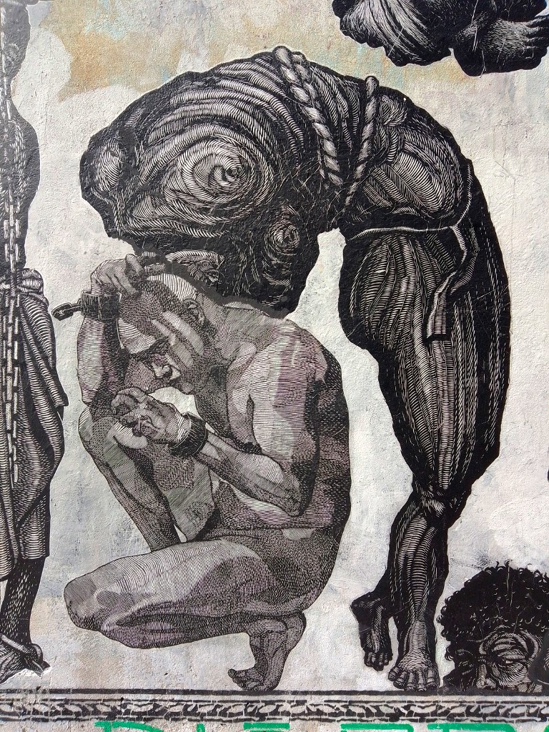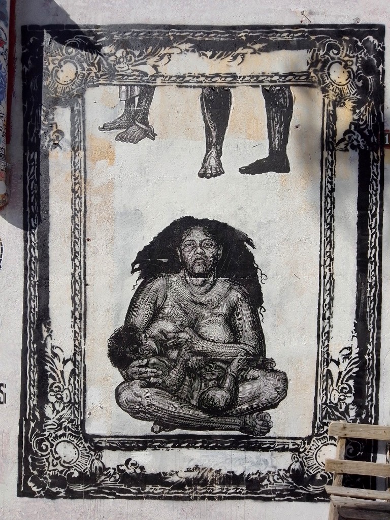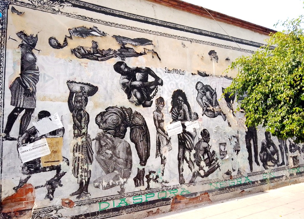 Par exemple, l’œuvre monumentale Diaspora noire, 500 ans d’esclavage (en ouverture de cet article et dans le diaporama). Cette œuvre, en accord avec le propriétaire du bâtiment, a été faite de jour en 10 heures, de midi à 20 heures, avec un petit groupe d’artistes bénévoles. Ce fut le premier projet puis chantier du collectif. Également sur la façade de Toro, située rue Morelos comme l’atelier, où pendant un an on a pu admirer des portraits illustrant différents caractères et émotions comme la colère, la folie, l’espoir, la peur (voir ici)… Mais en général, après un appel à participation au sein du collectif, l’affichage se fait sans demander de permission, plutôt de nuit.
